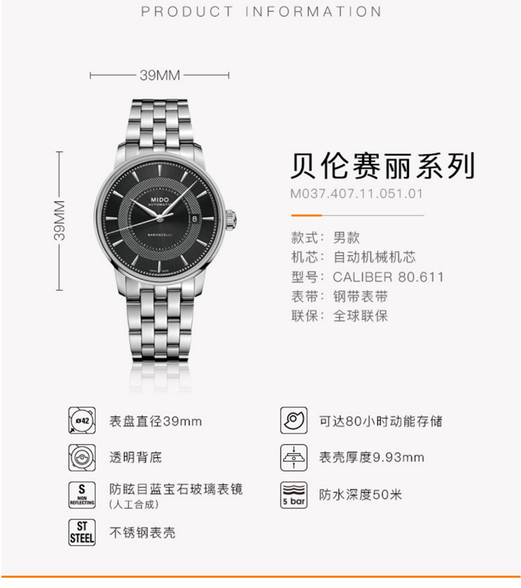 商品名称:MIDO美度 贝伦赛丽系列印记款机械男士腕表 (不支持无理由退换货)