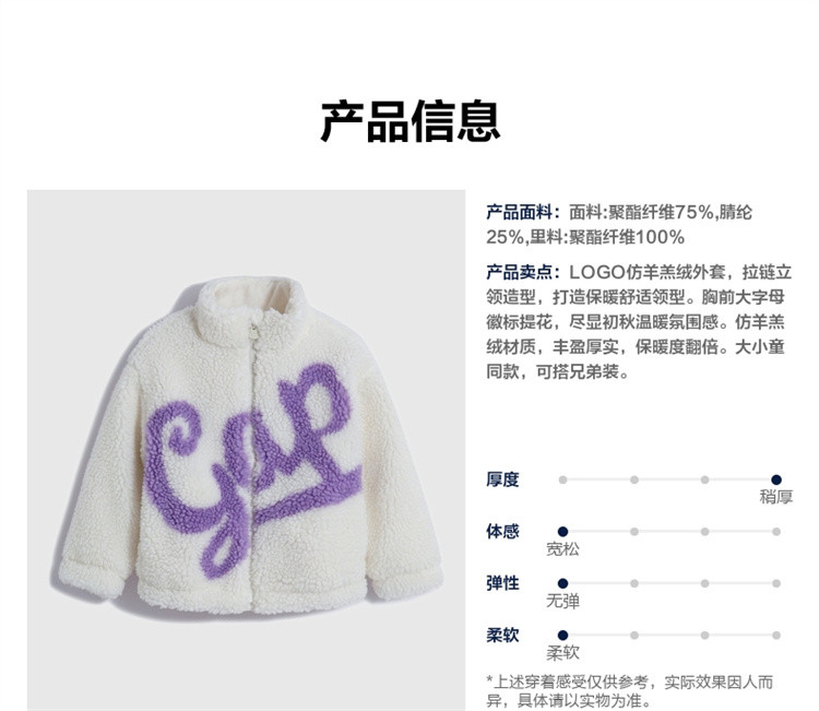 商品名称:Gap女幼童春秋LOGO仿羊羔绒立领外套789199儿童装加厚夹克 788954
