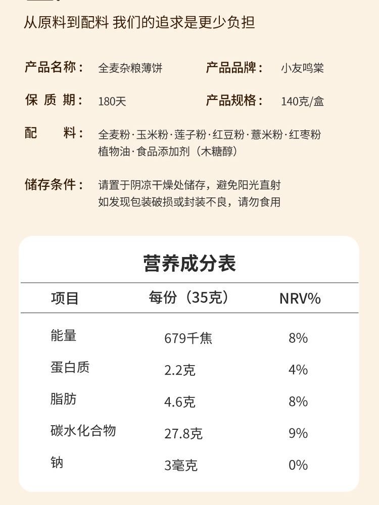 商品名称:小友鸣棠全麦杂粮薄饼140g