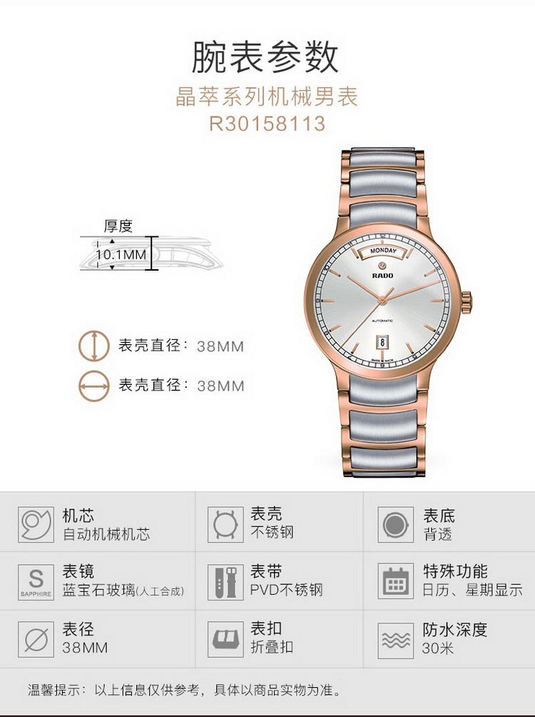 商品名称:雷达RADO 晶萃系列男士钢带机械手表 R30158113