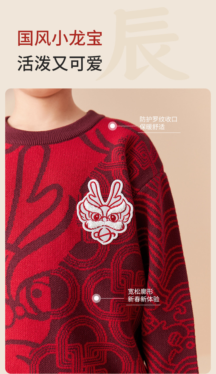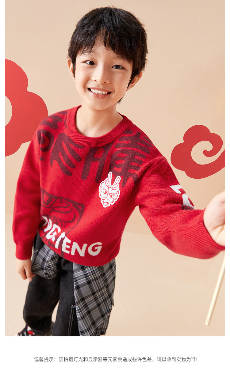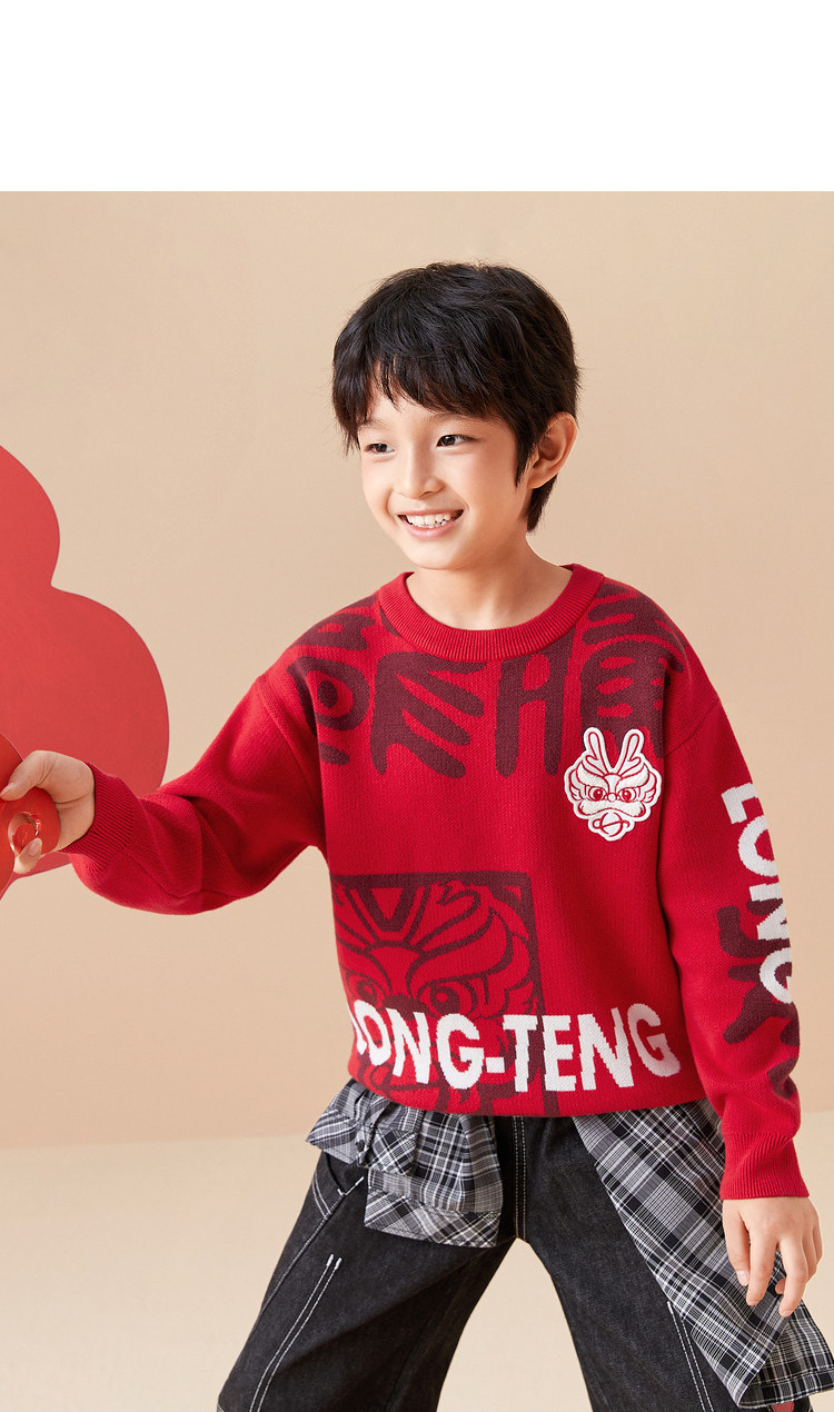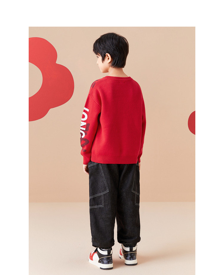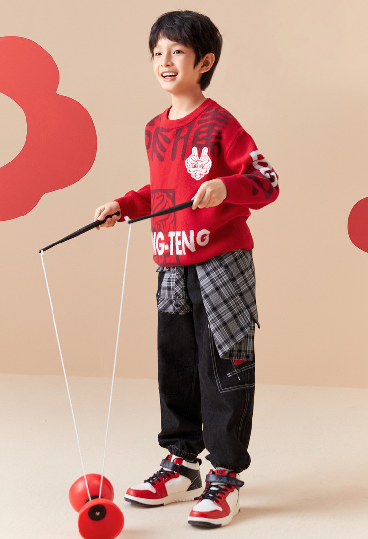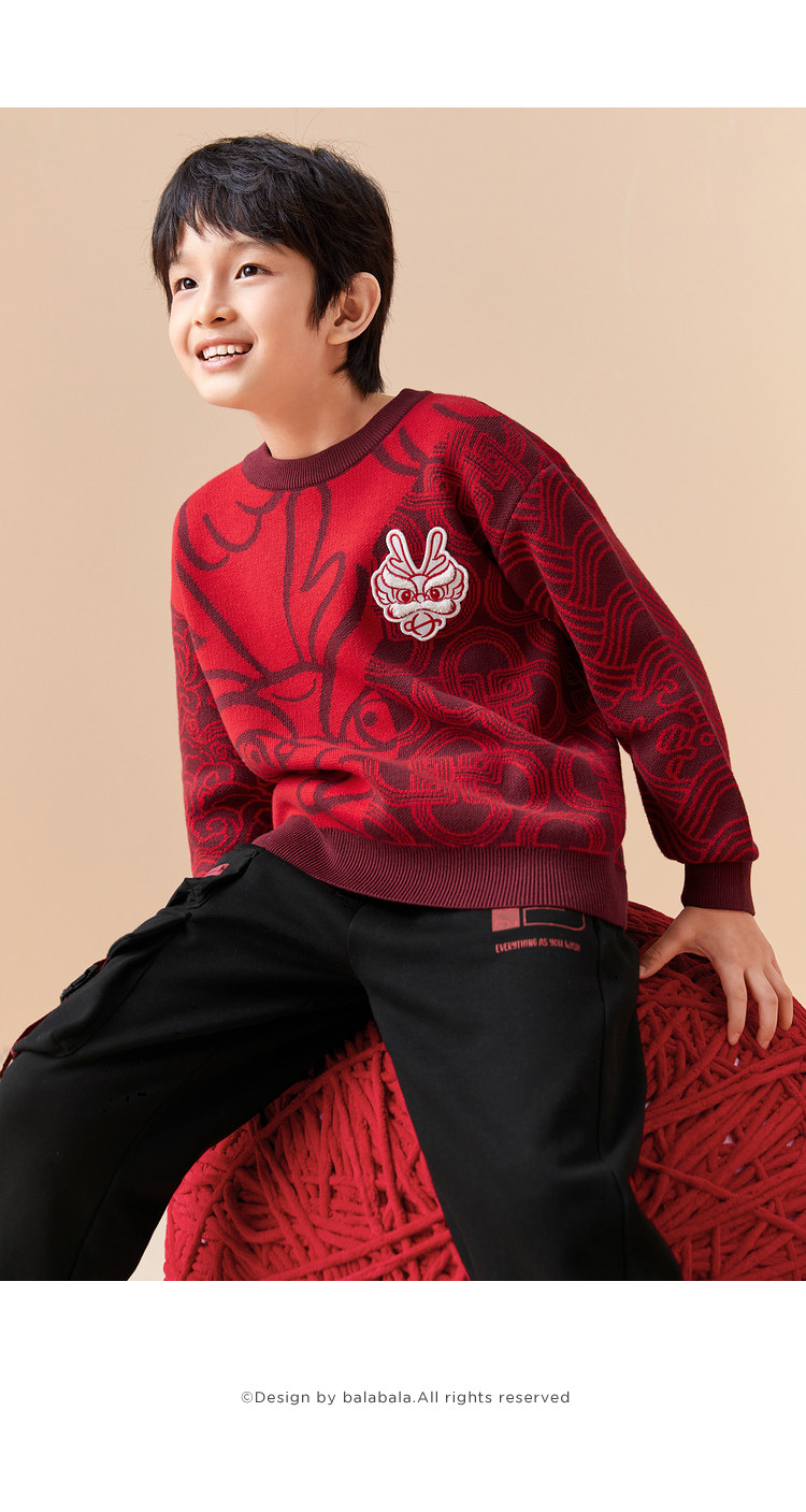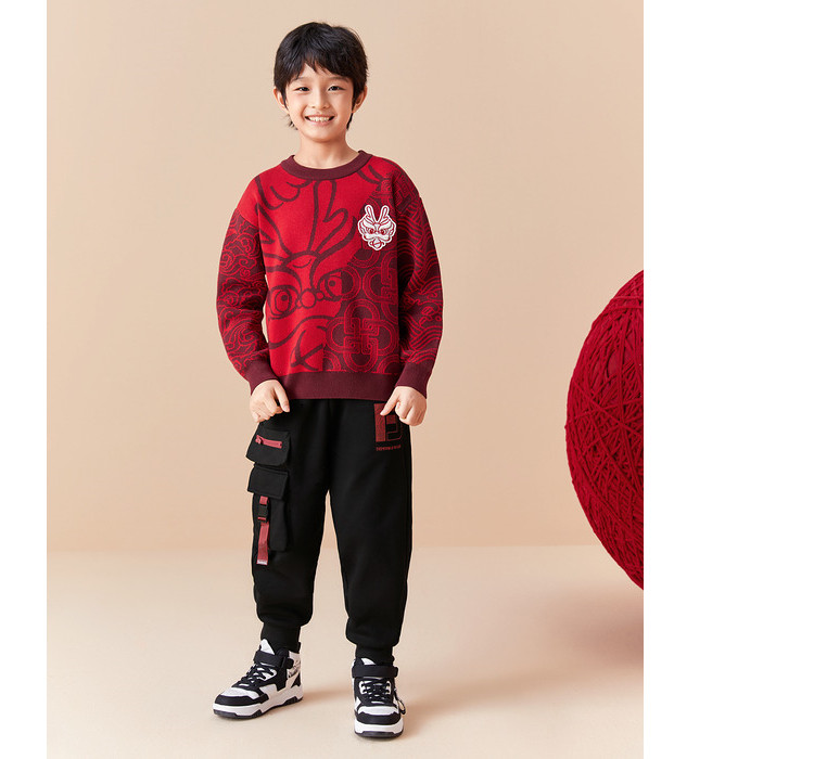 商品名称:国风龙年提花纯棉春秋童装儿童针织衫中大童圆领毛衫男童红色上衣 395333