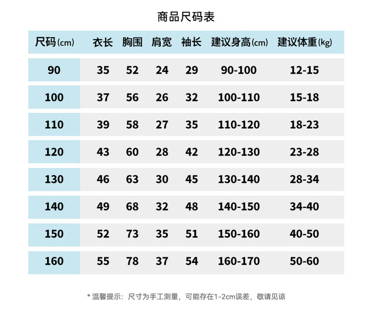尺码 衣长(cm) 肩宽(cm) 身高(cm) 袖长(cm) 适合年龄 胸围(cm) 号型