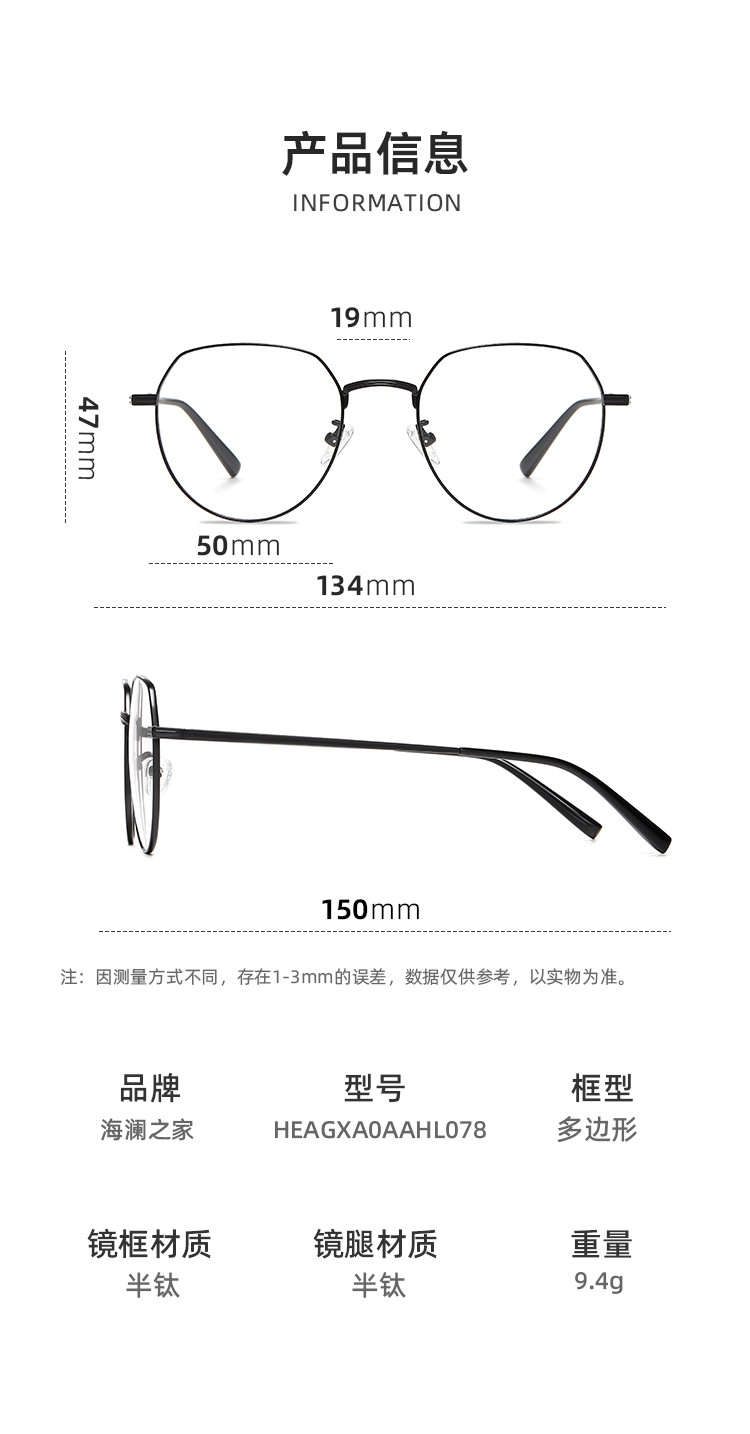 镜框宽:51mm 鼻梁宽:20mm 镜腿长:145mm
