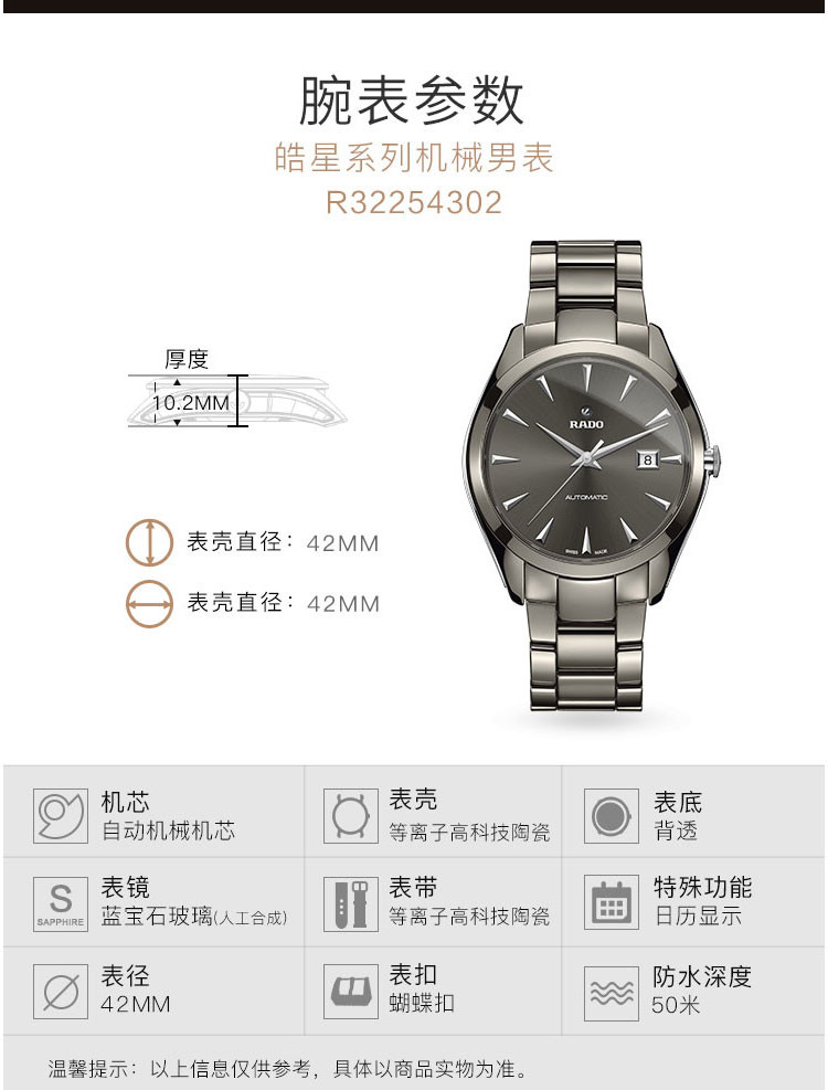 商品名称:雷达RADO 皓星系列男士等离子高科技陶瓷表壳动力储存机械手表 R32254302