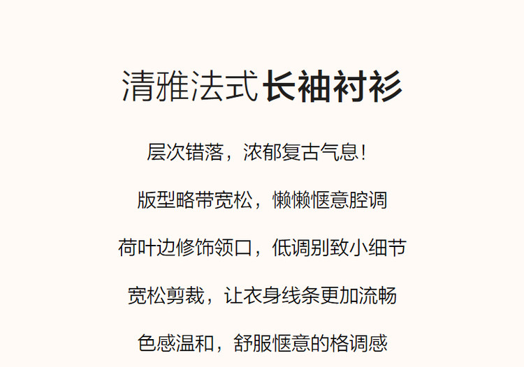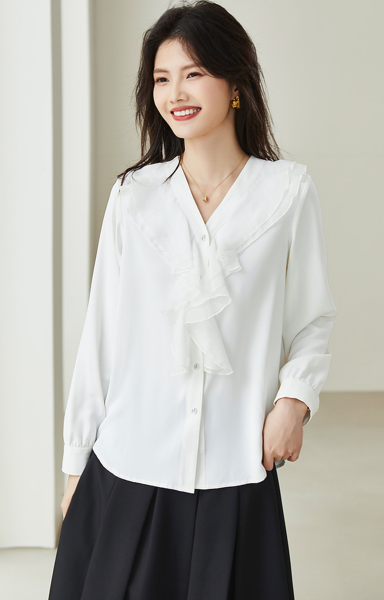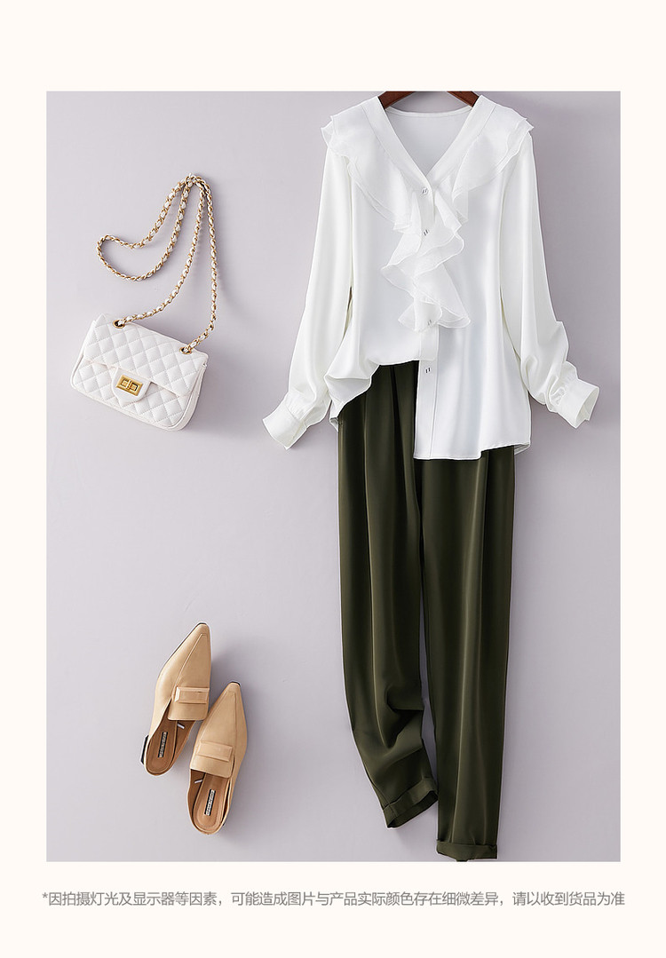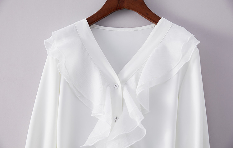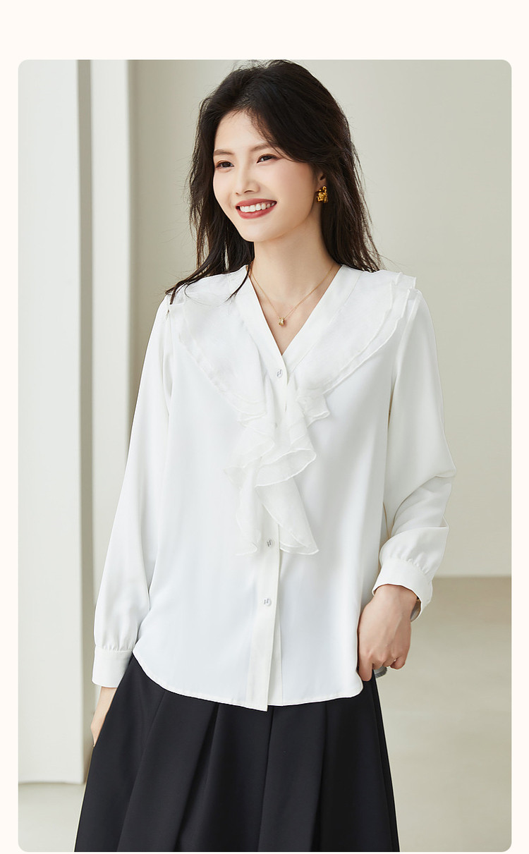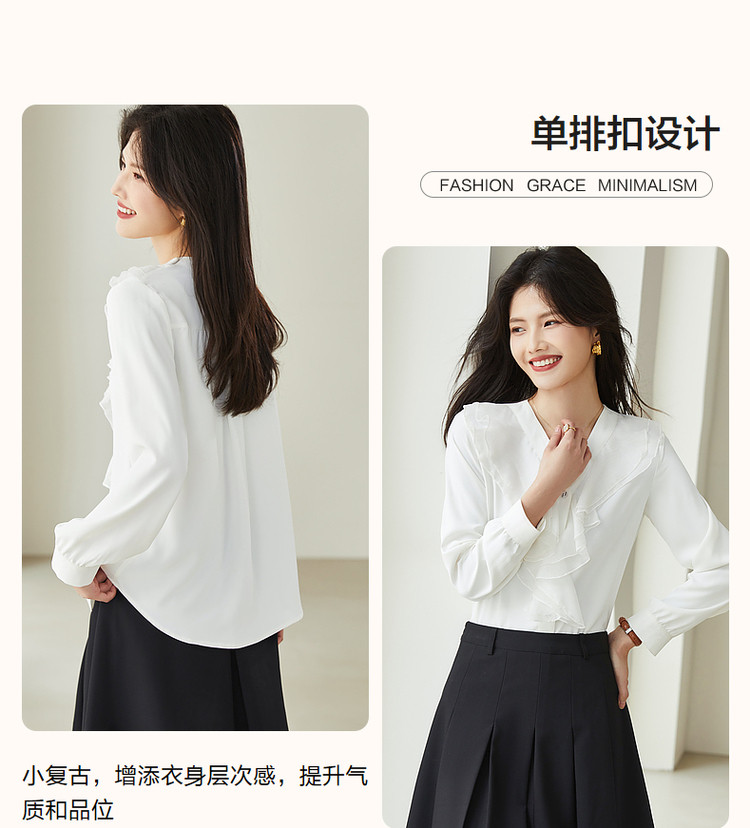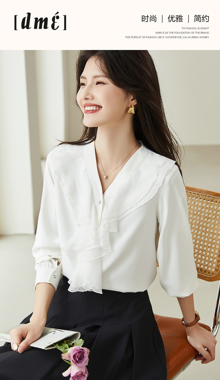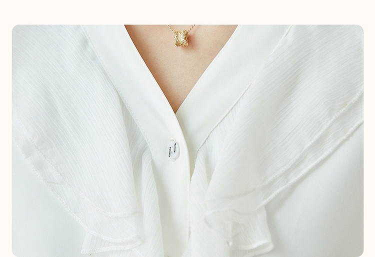 商品名称:【香榭丽舍系列】秋日法腔V领唯美花边丝滑雪纺衬衣女装上衣 696769