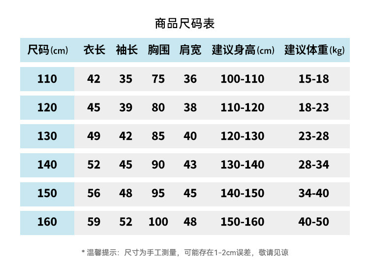 | 尺码 | 衣长(cm) | 肩宽(cm) | 身高(cm) | 袖长(cm) | 适合年龄 | 胸围(cm) | 号型 |