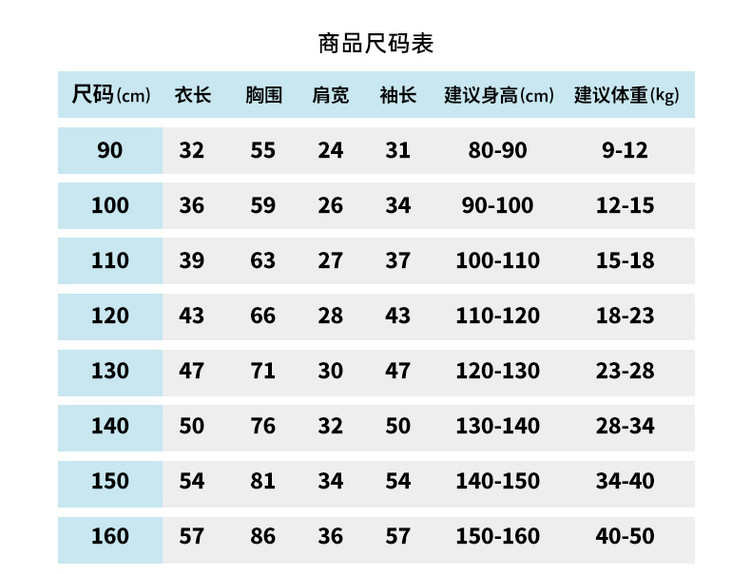 | 尺码 | 衣长(cm) | 肩宽(cm) | 身高(cm) | 袖长(cm) | 适合年龄 | 胸围(cm) | 号型 |