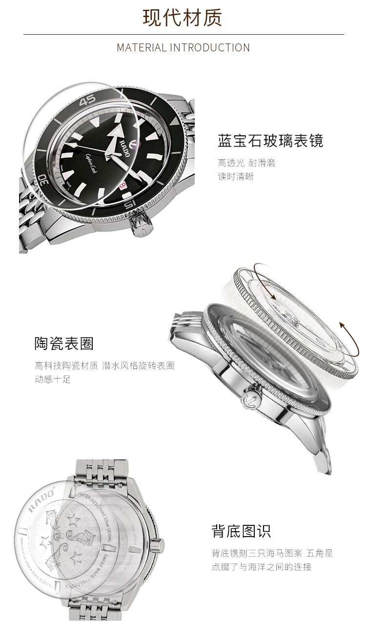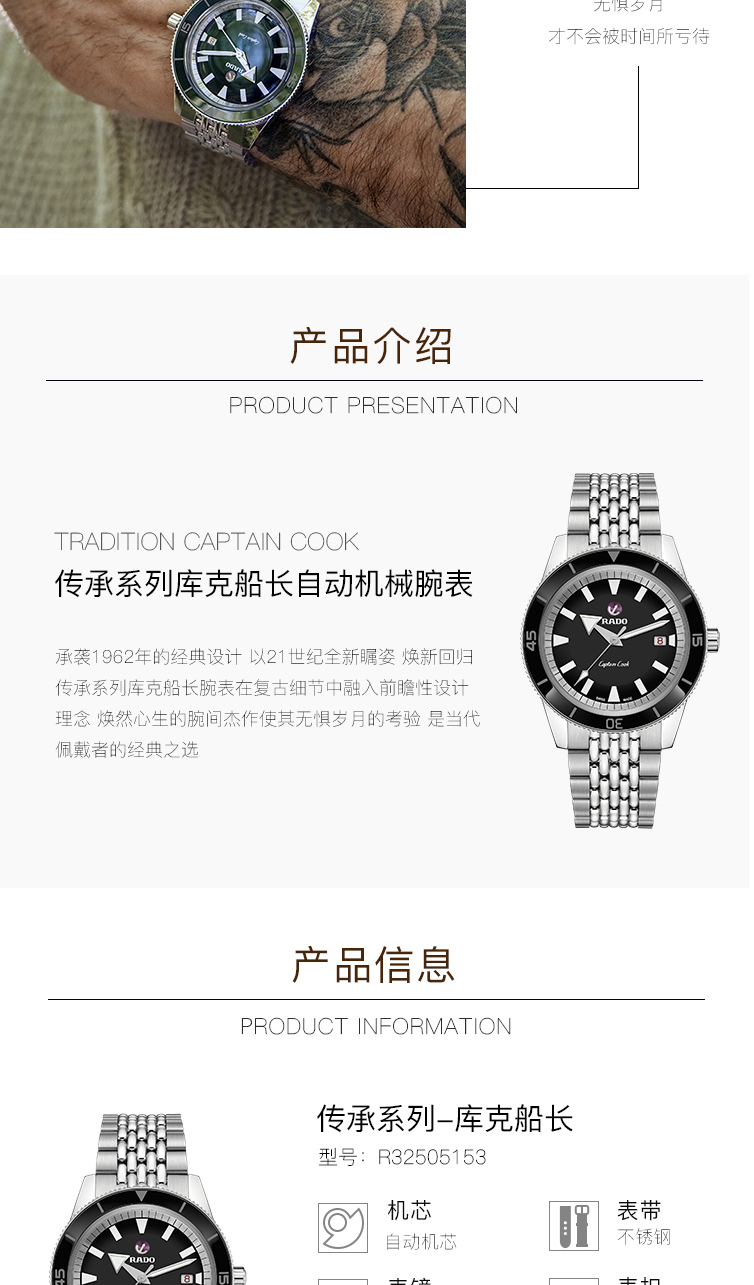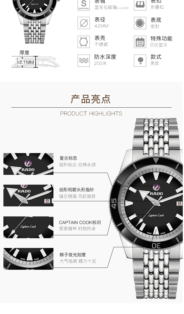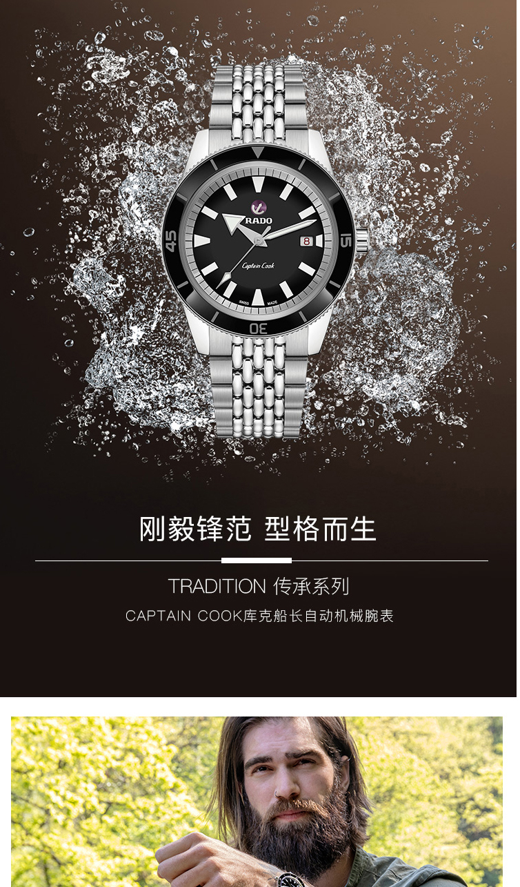 商品名称:RADO雷达 传承系列库克船长自动机械钢带男士腕表(42mm) R32505153