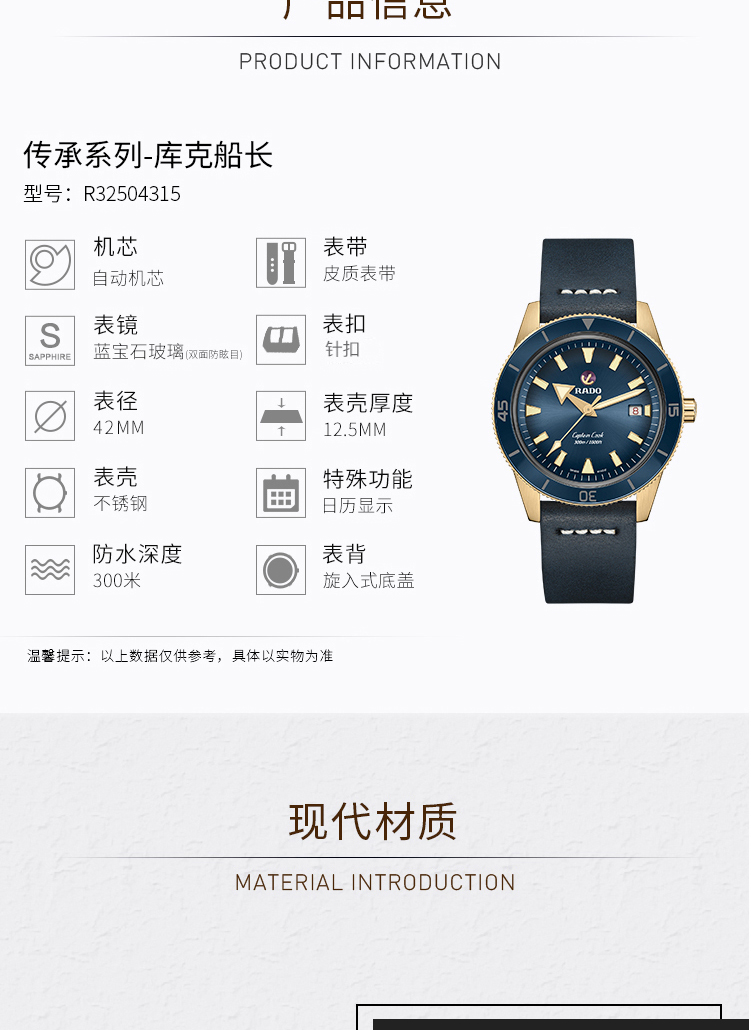 商品名称:RADO雷达 传承系列库克船长自动机械手表青铜男士腕表(42mm) R32504205