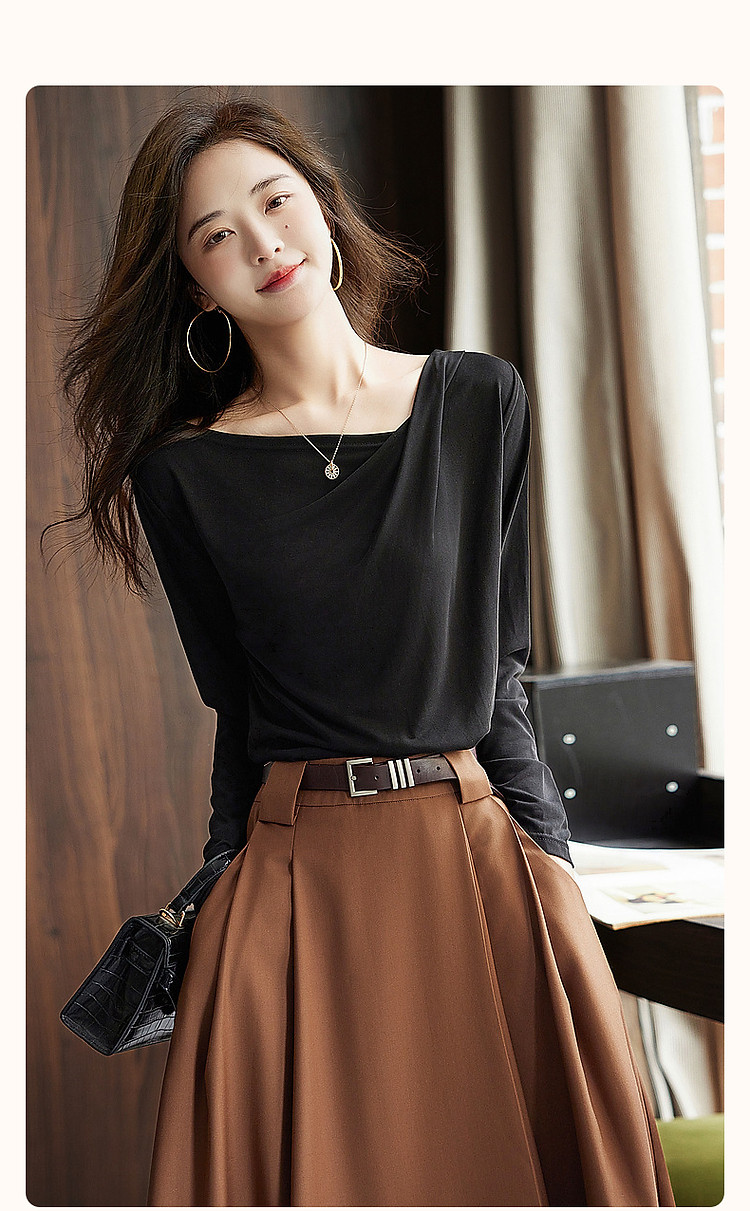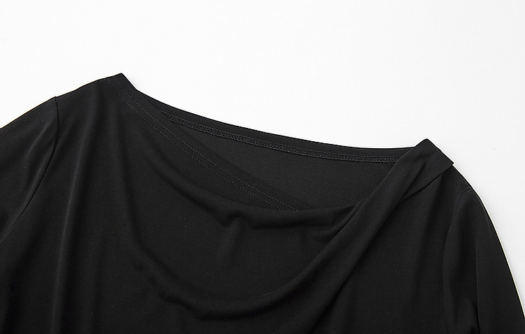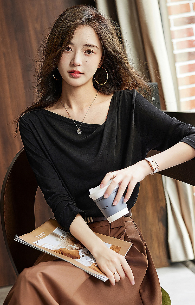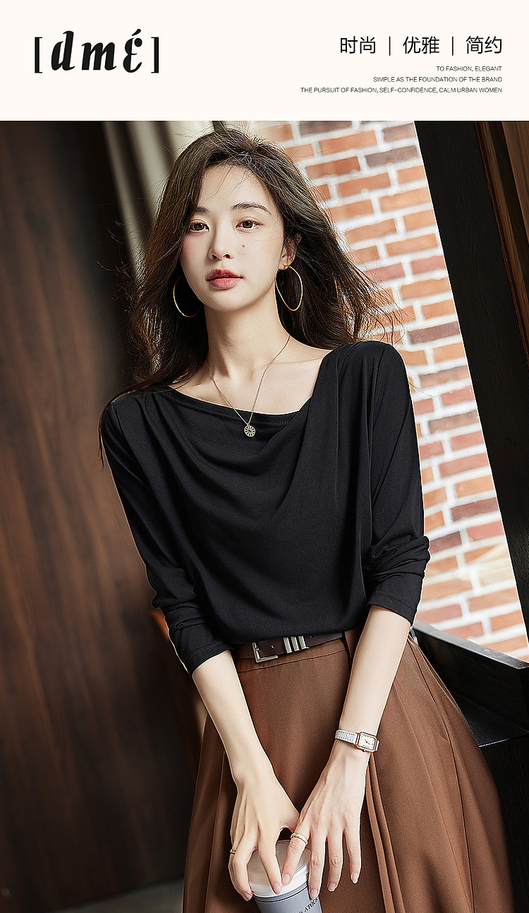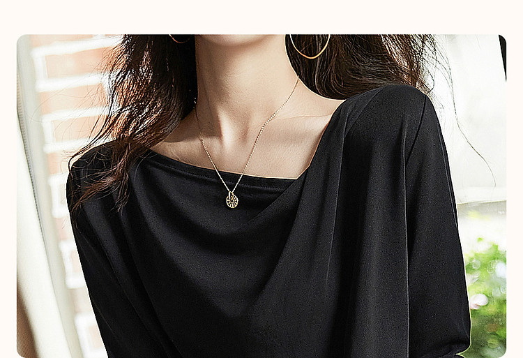 商品名称:【简约风荡领女式t恤】春秋微弹气质连肩中袖t恤女 076161