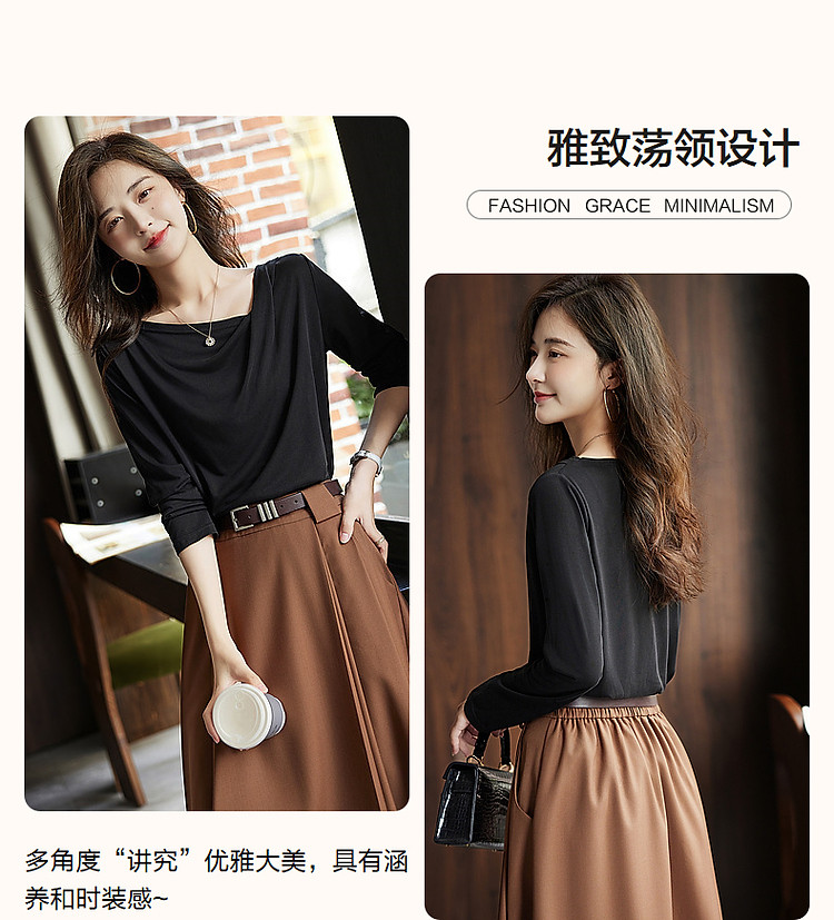 【简约风荡领女式t恤】春秋微弹气质连肩中袖t恤女 076161