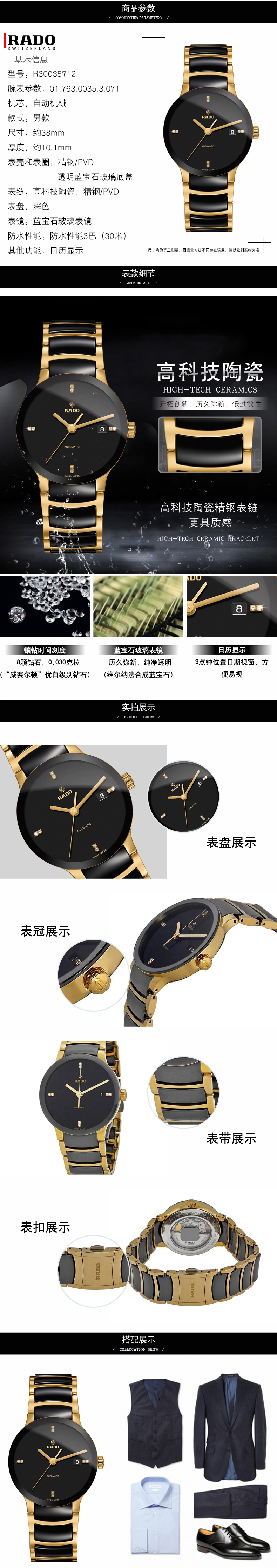 商品名称:雷达RADO 晶萃系列男表黑盘间金陶瓷带机械手表 R30035712