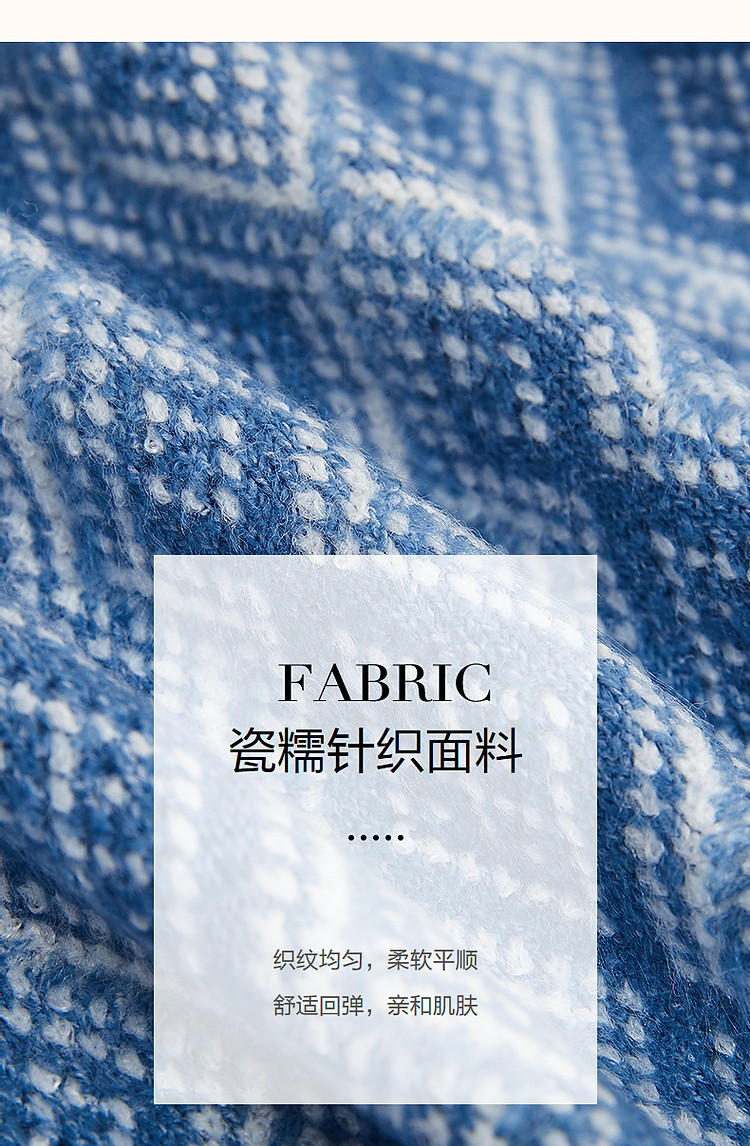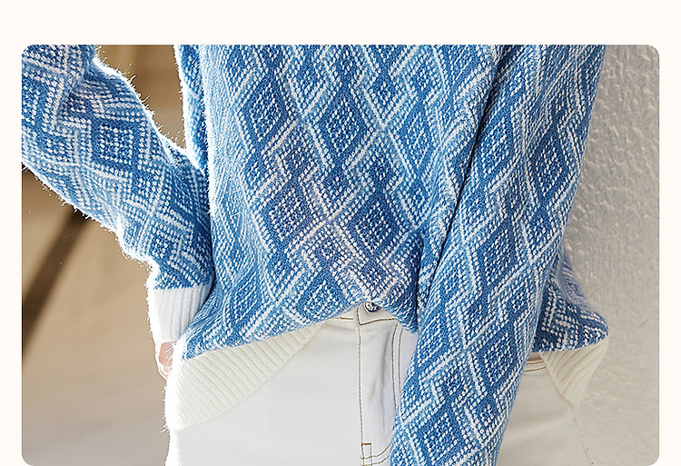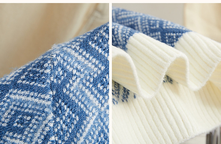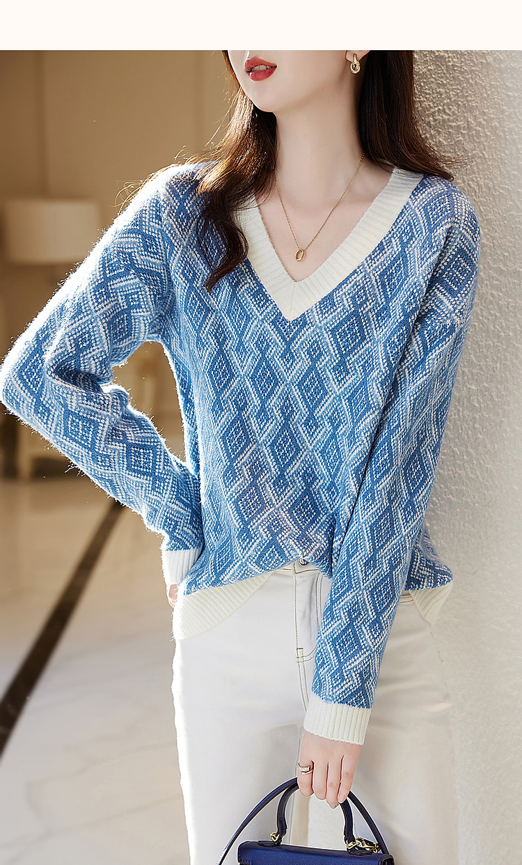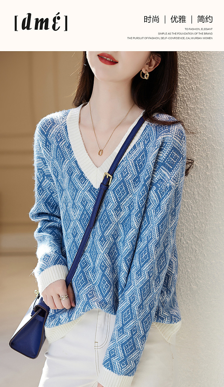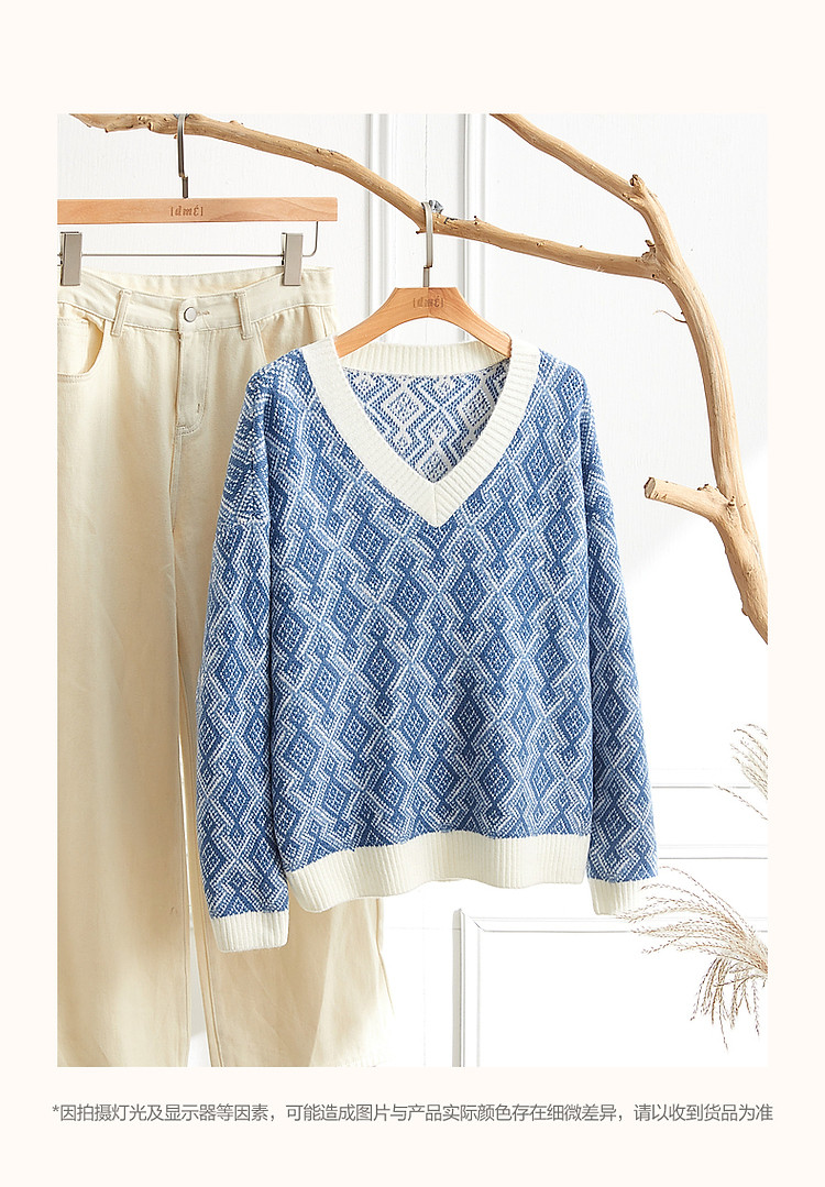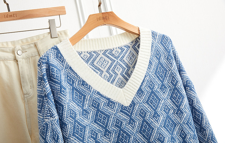 商品名称:【多季通穿】春秋复古V领撞色格纹提花线衫柔肤遮肉针织衫女上衣 370113