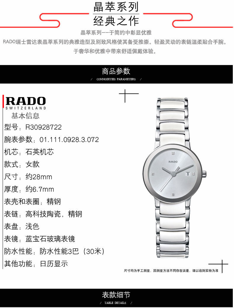 商品名称:雷达(RADO)瑞士手表 晶萃系列女陶瓷表带石英手表 R30928722