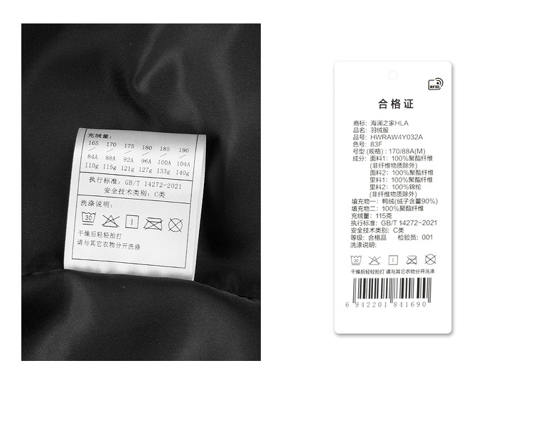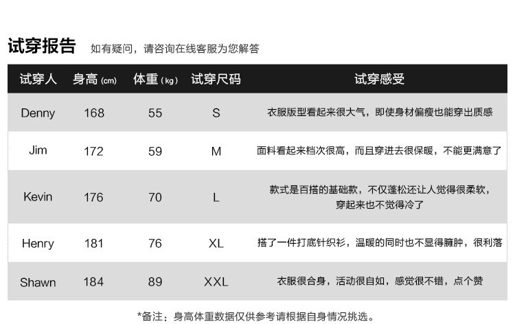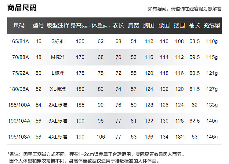 | 尺码 | 衣长(cm) | 肩宽(cm) | 袖长(cm) | 充绒量(g) | 胸围(cm) | 号型 |