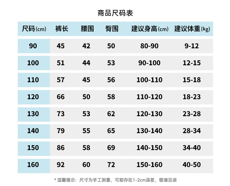 尺码 身高(cm) 腰围(cm) 裤长(cm) 臀围(cm) 适合年龄 号型