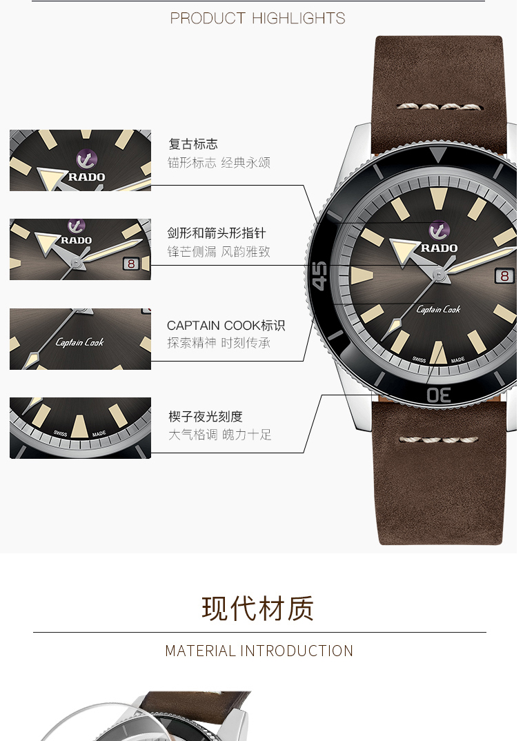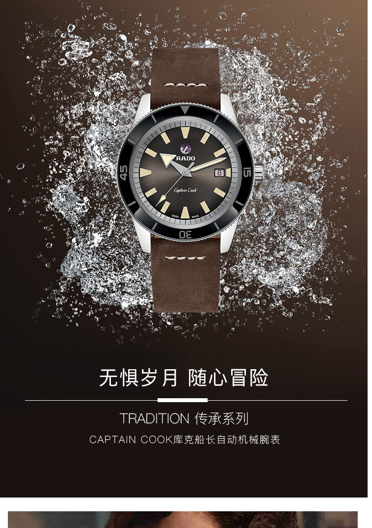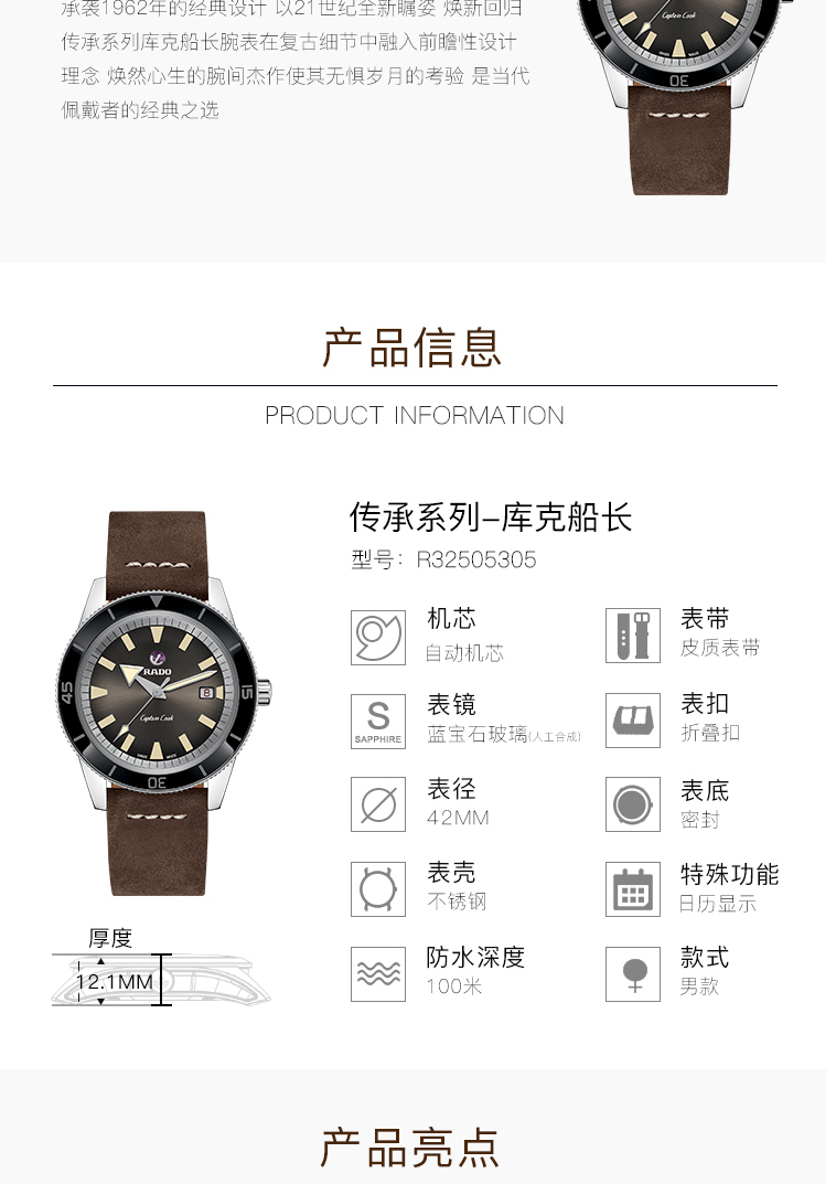 商品名称:RADO雷达 传承系列库克船长自动机械皮带男士腕表(42mm) R32505305