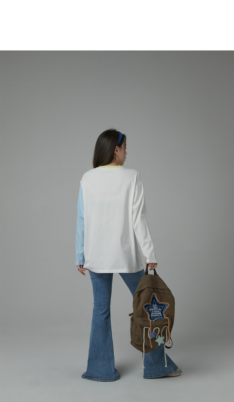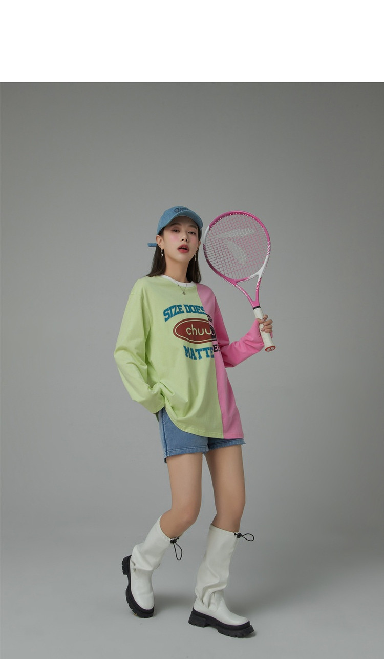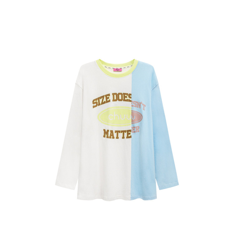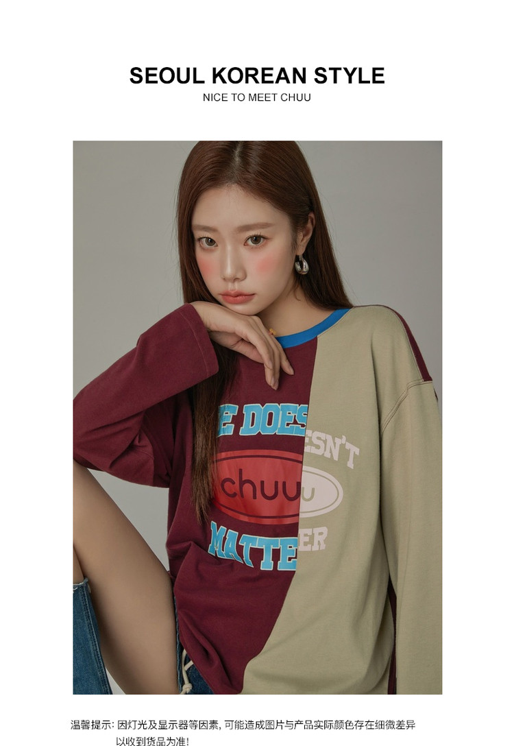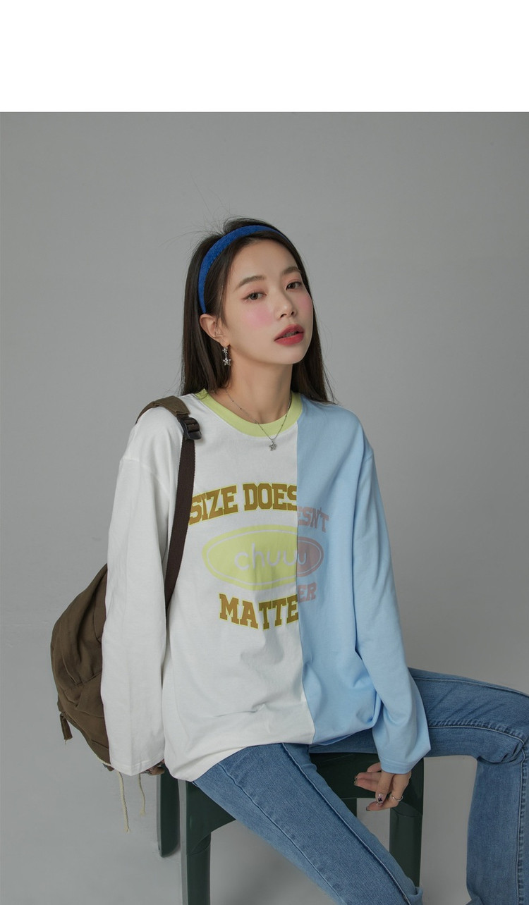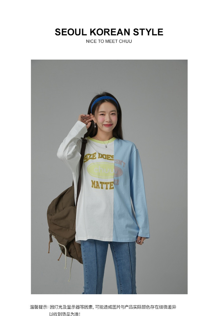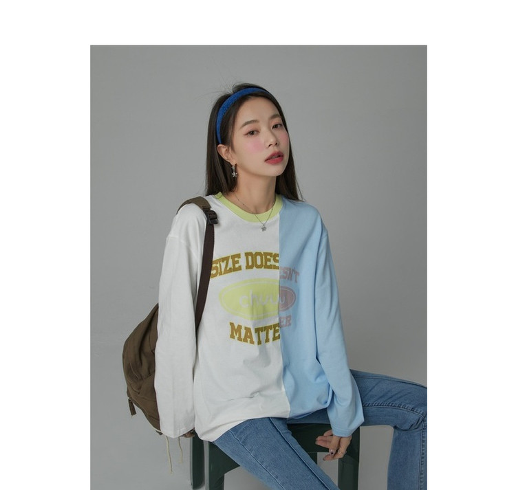 商品名称:假两件拼接T恤女士春秋圆领宽松字母撞色长袖上衣 016147