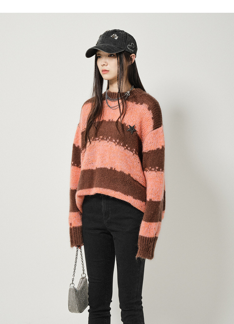 地素条纹套头毛衣春秋季慵懒金属胸针装饰长袖上衣女 811915