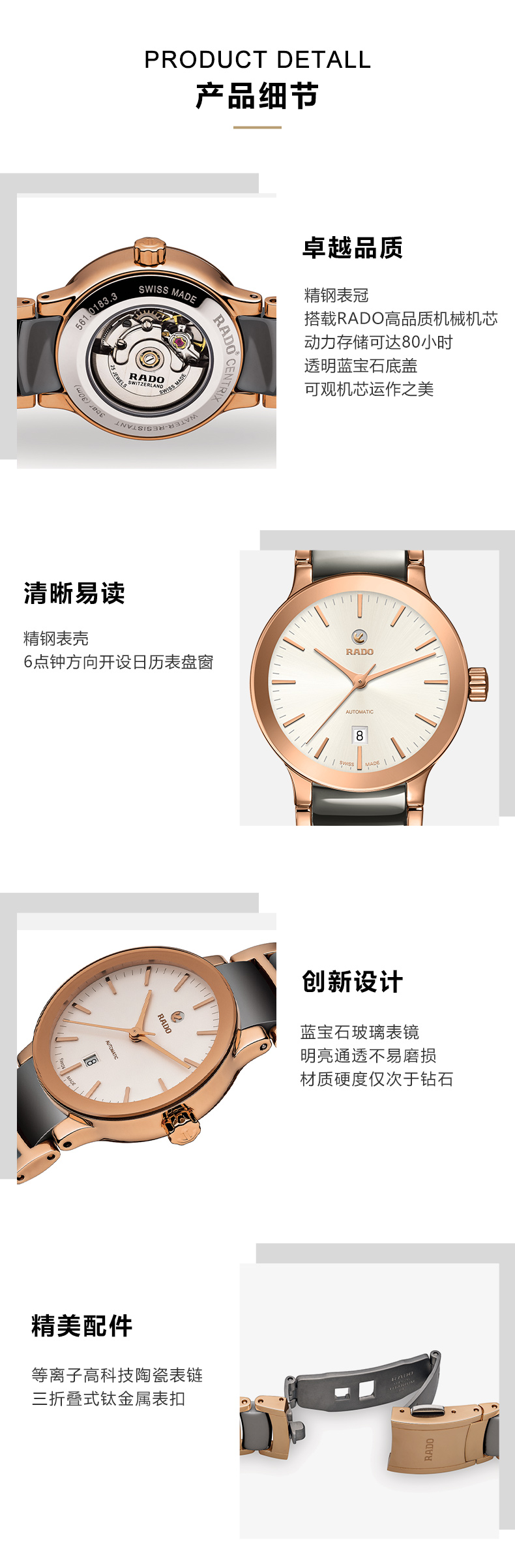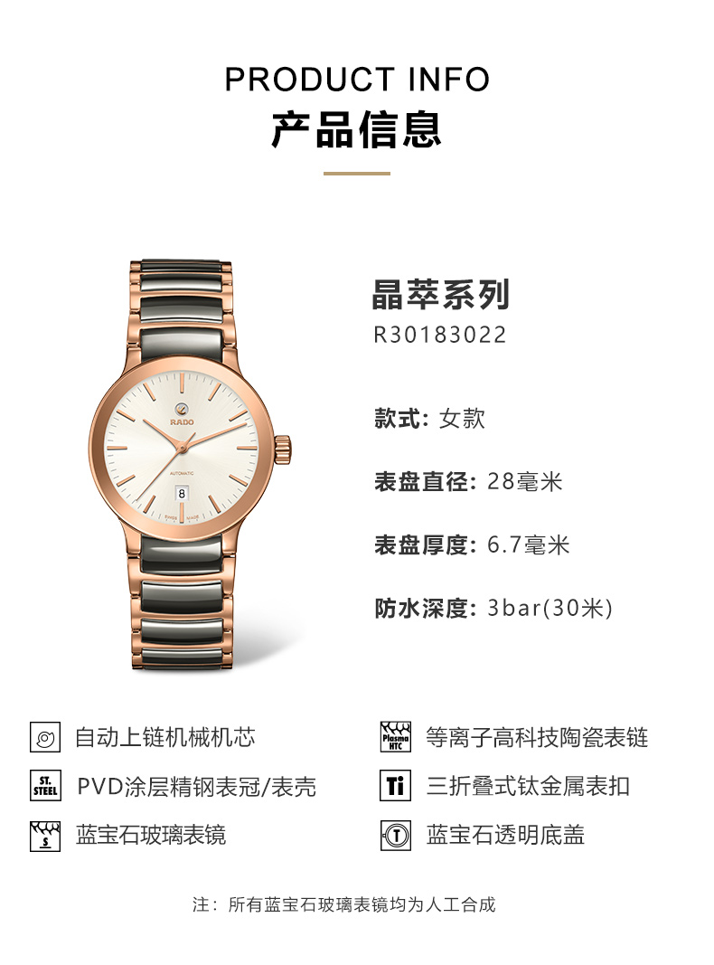 商品名称:RADO雷达 晶萃系列陶瓷机械女士腕表 R30183022