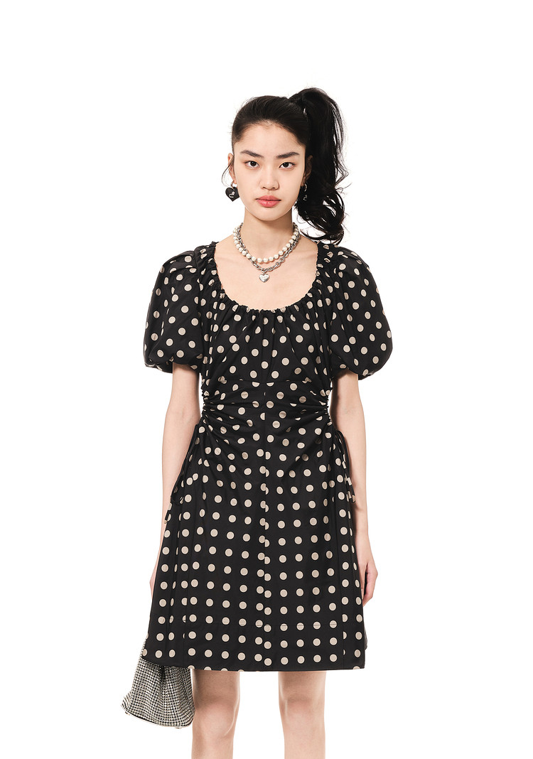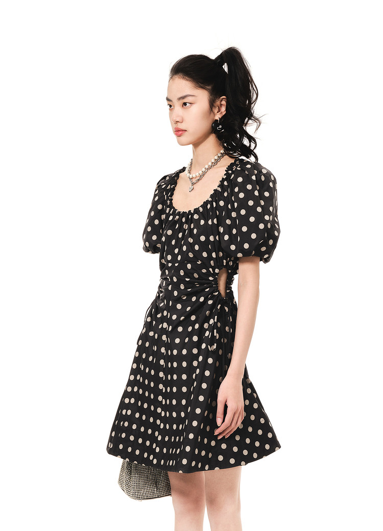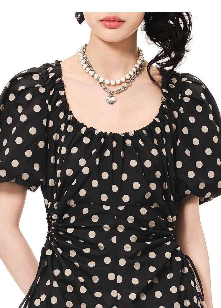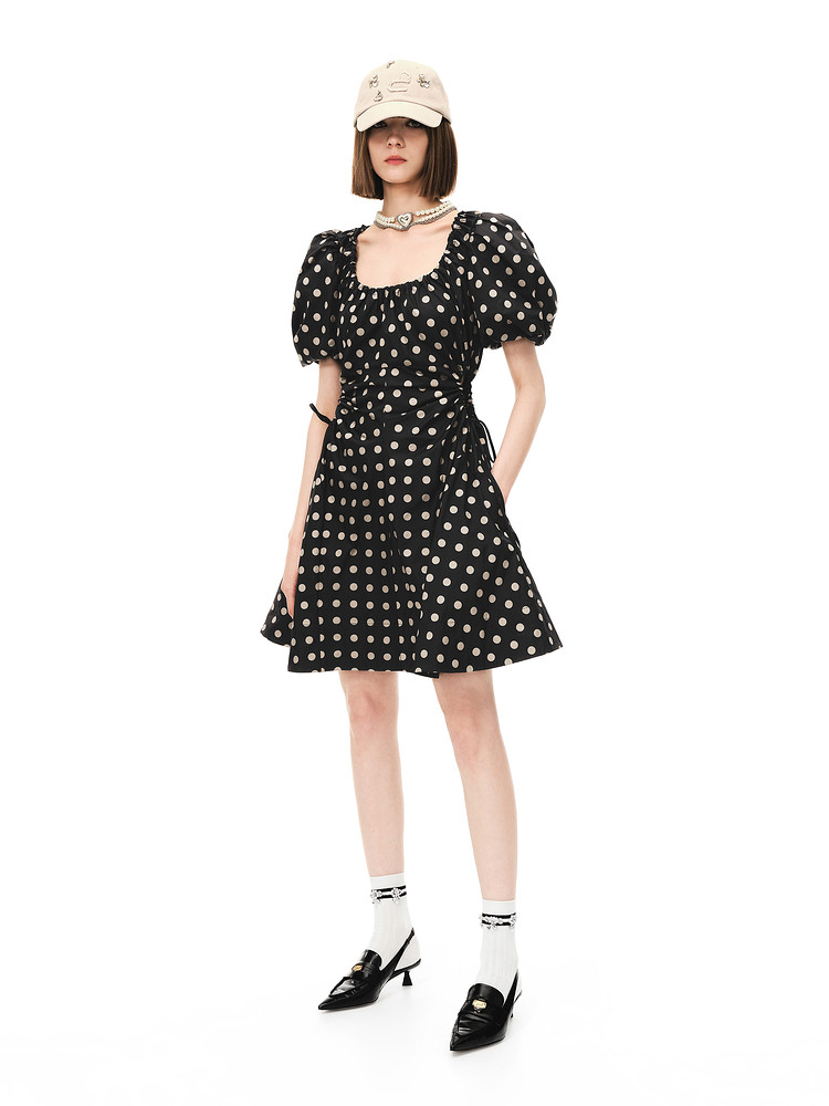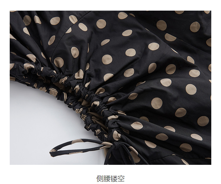 地素连衣裙夏秋季专柜波点腰间镂空泡泡袖复古裙女 008907