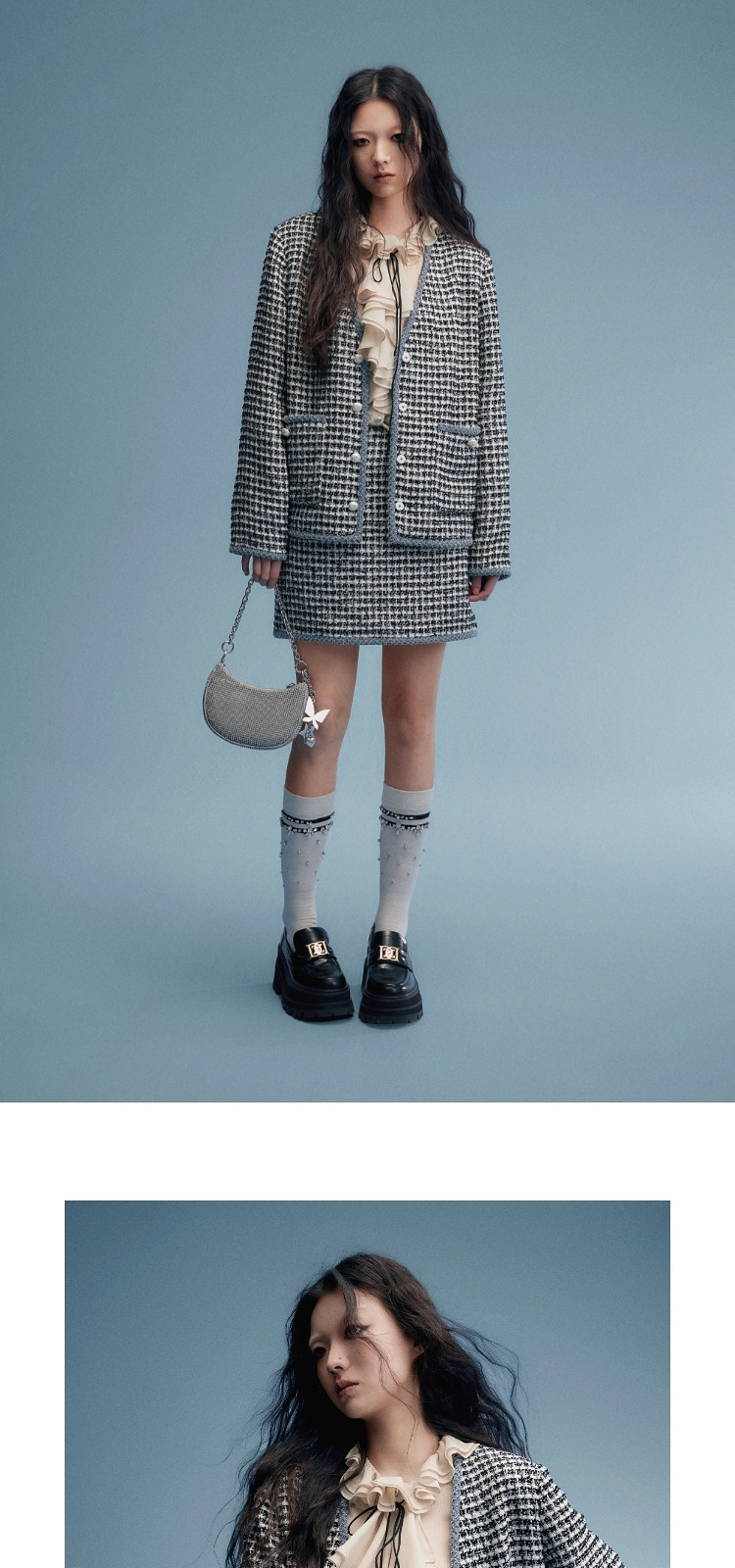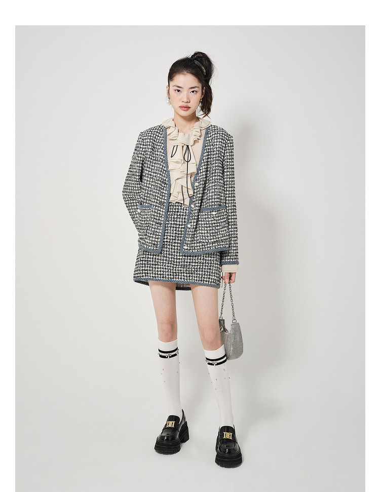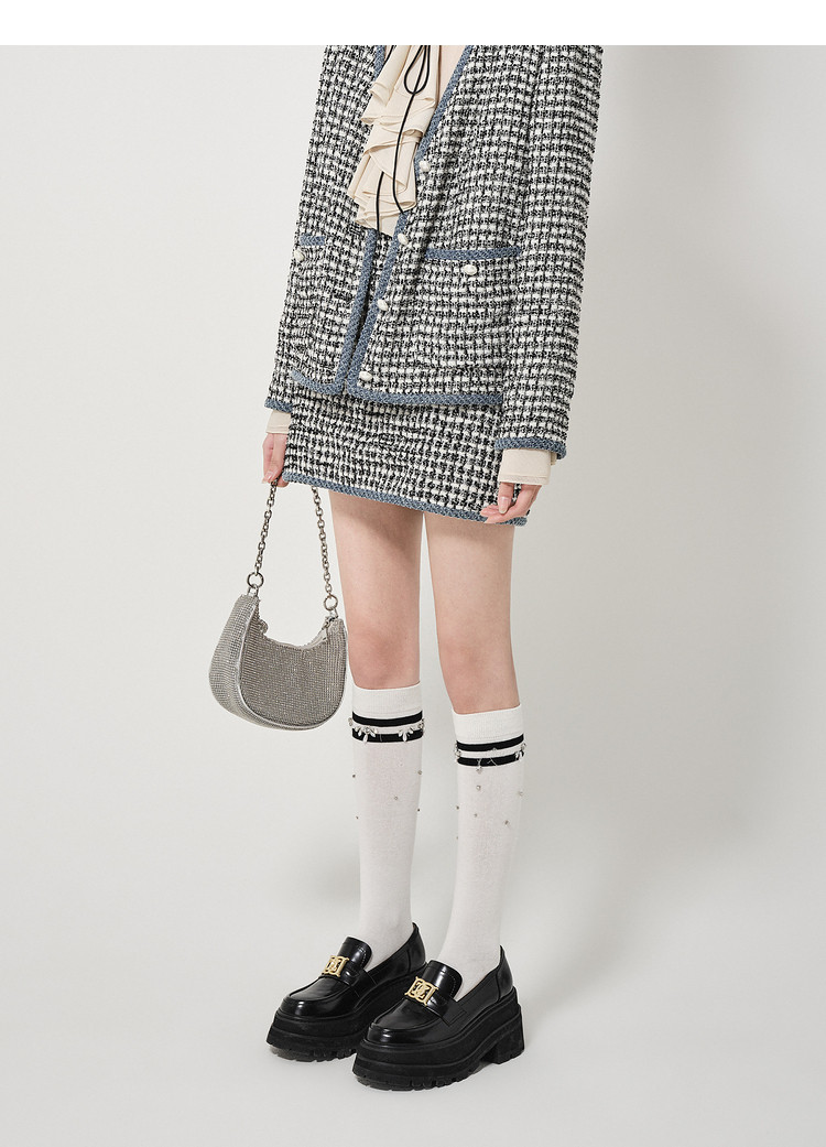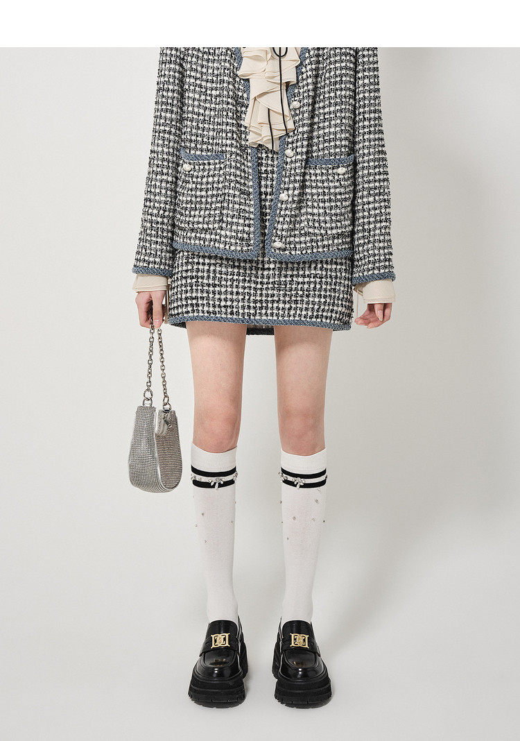 地素黑白格粗花呢半裙秋小香风口袋设计短裙女 980811