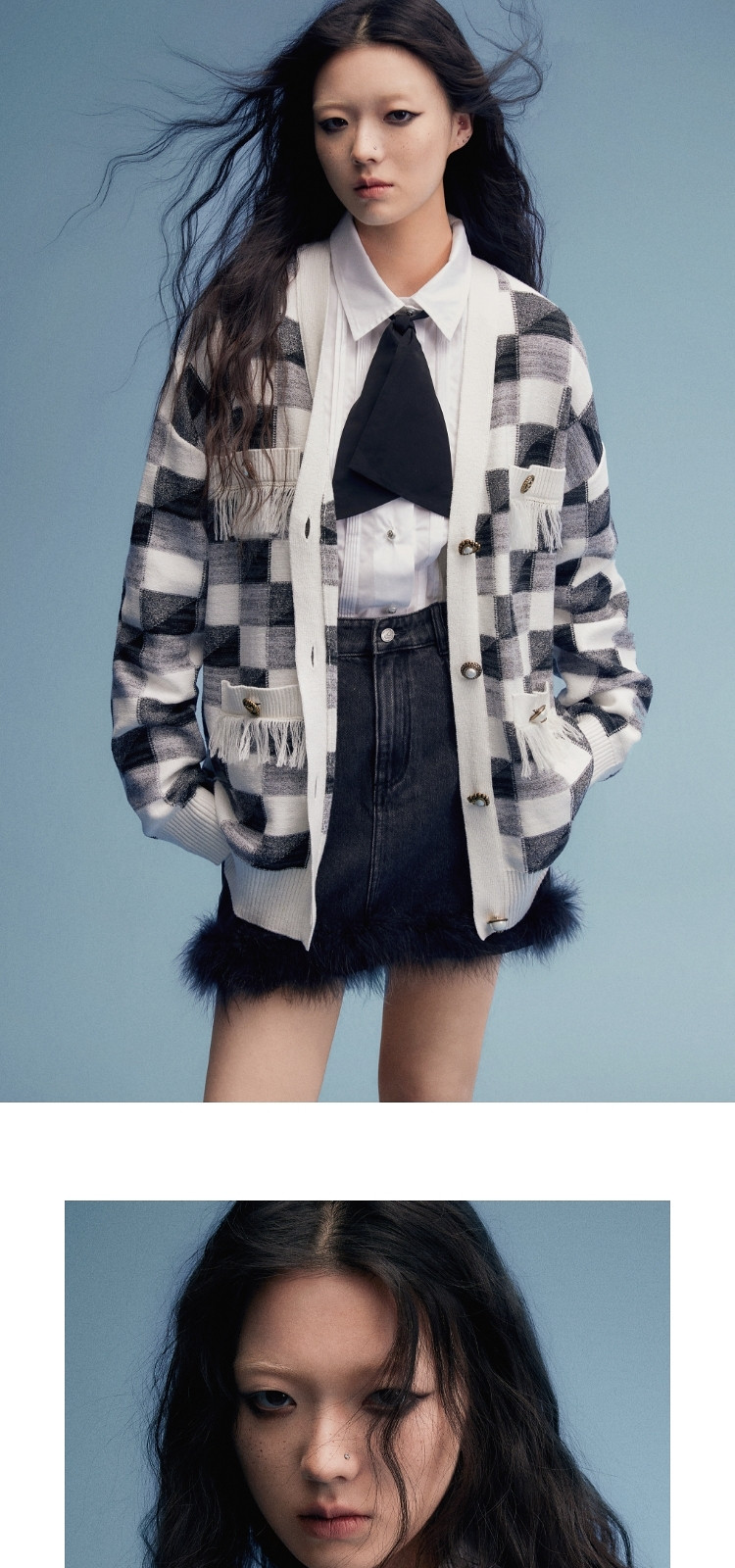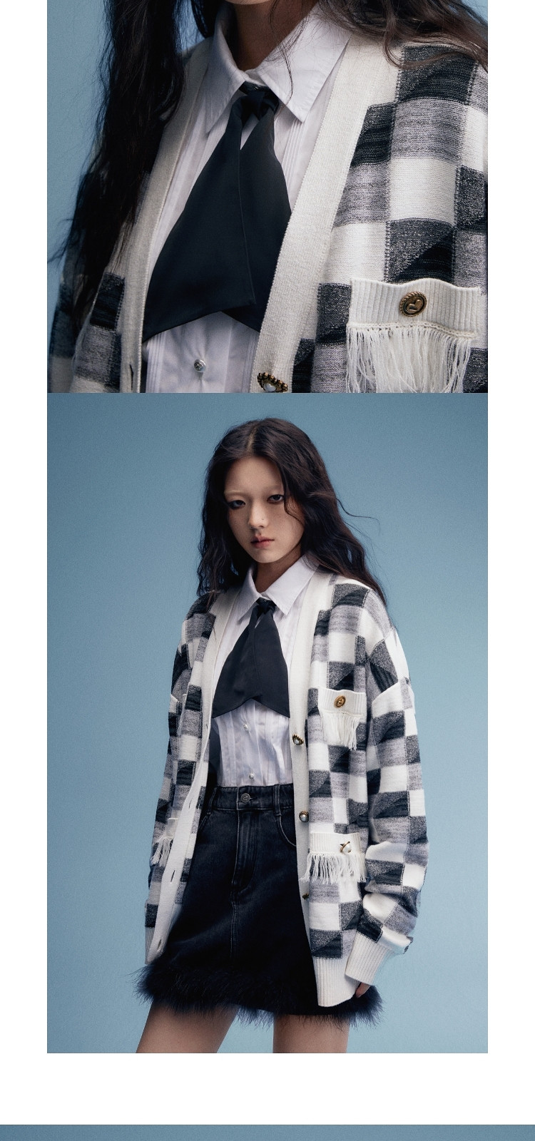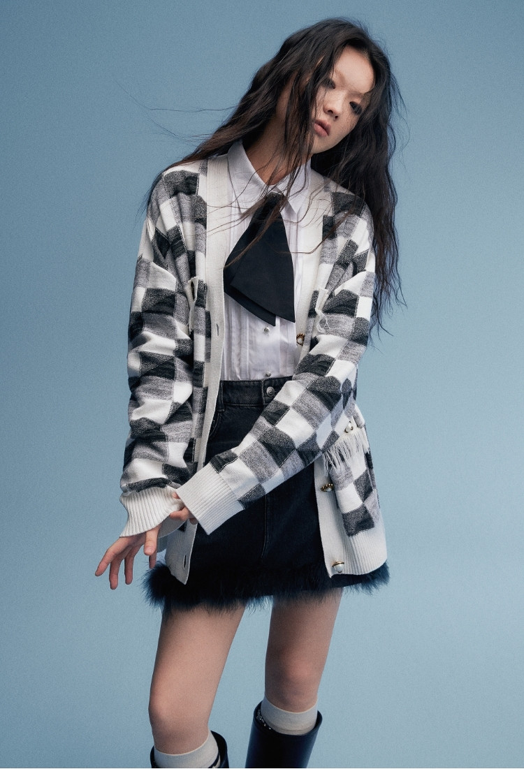 地素针织衫春秋专柜黑白格纹流苏边设计宽松外套女 079115