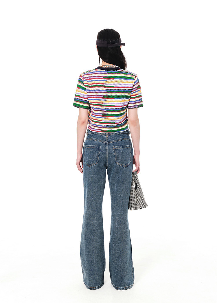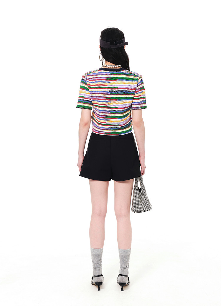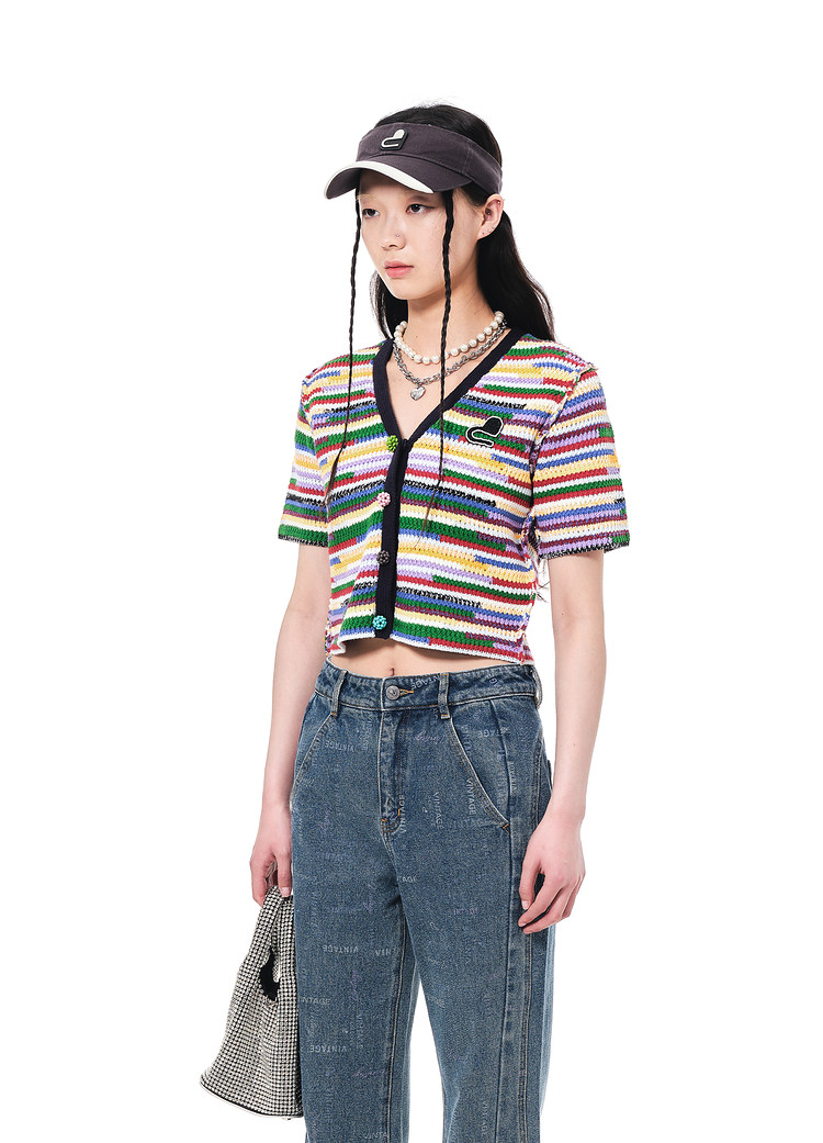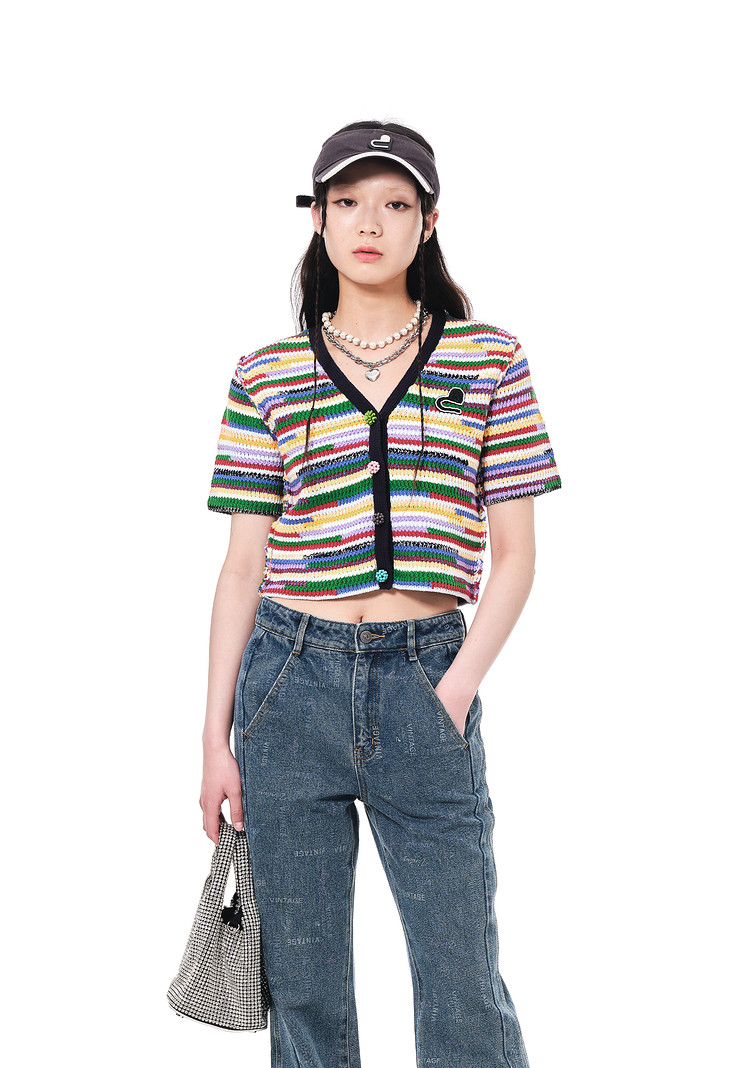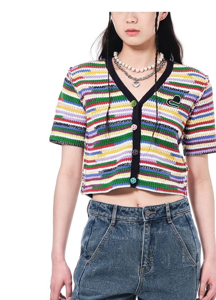 地素夏秋季彩虹条纹多色花朵纽扣针织开衫设计感小众 752523