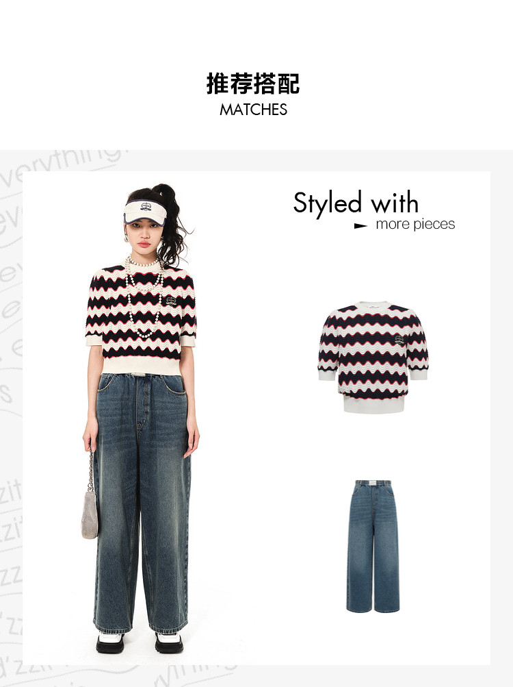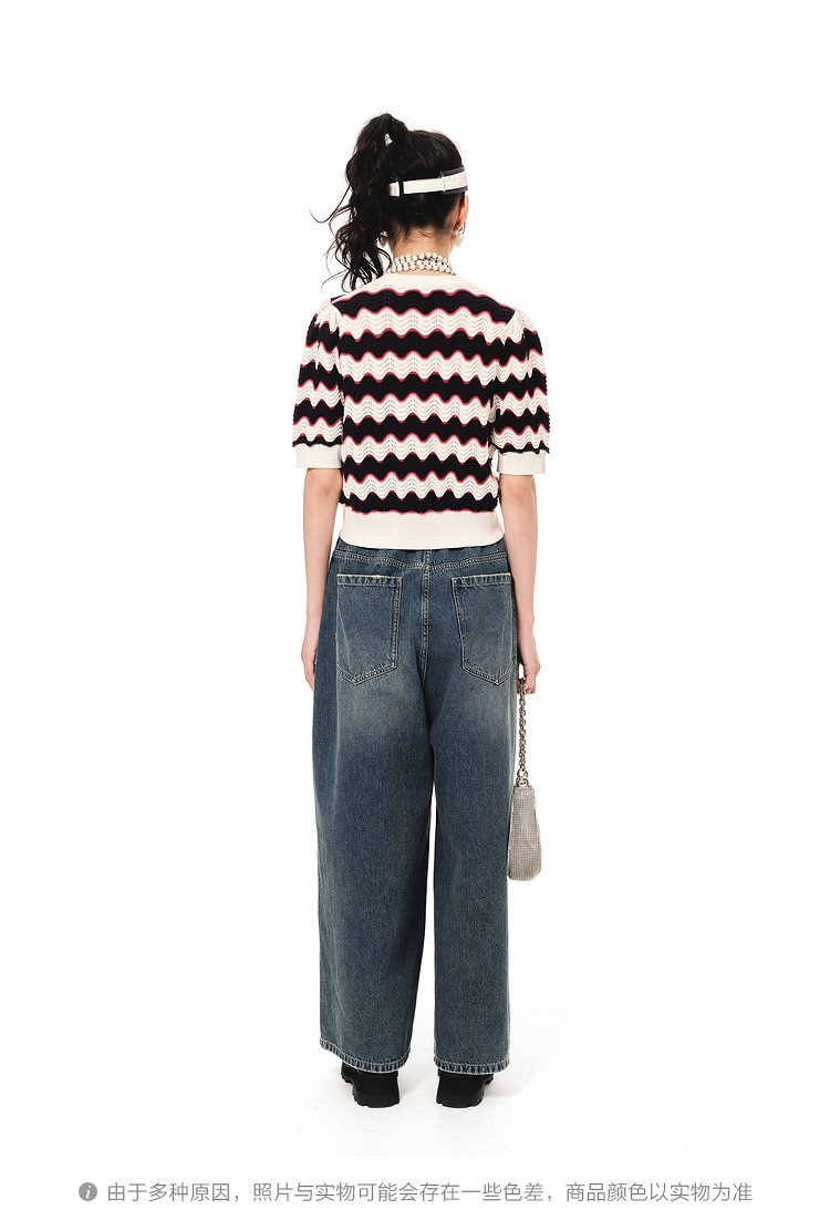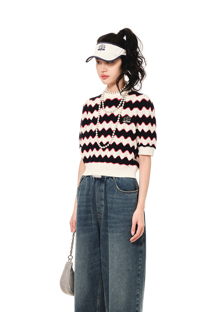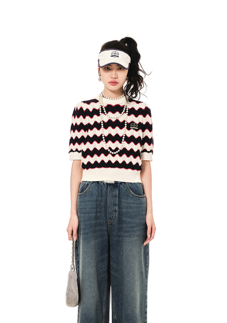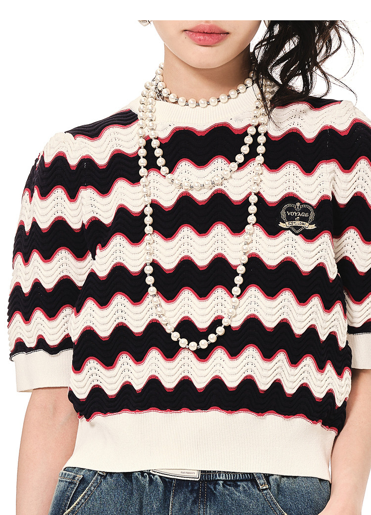 地素夏秋法式复古波浪条纹撞色设计肌理感短袖针织衫 591115