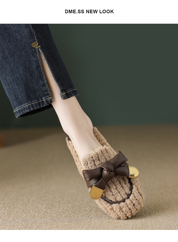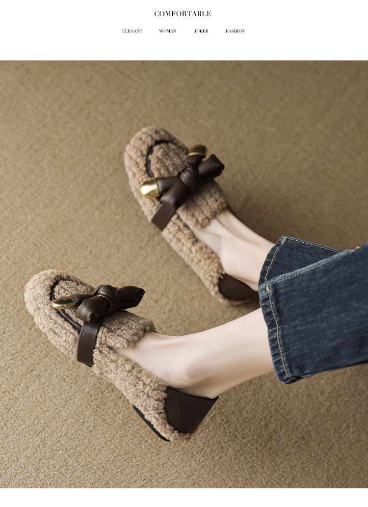 春美拉德色系毛毛鞋女外穿棉单鞋时尚蝴蝶结平底鞋 065793