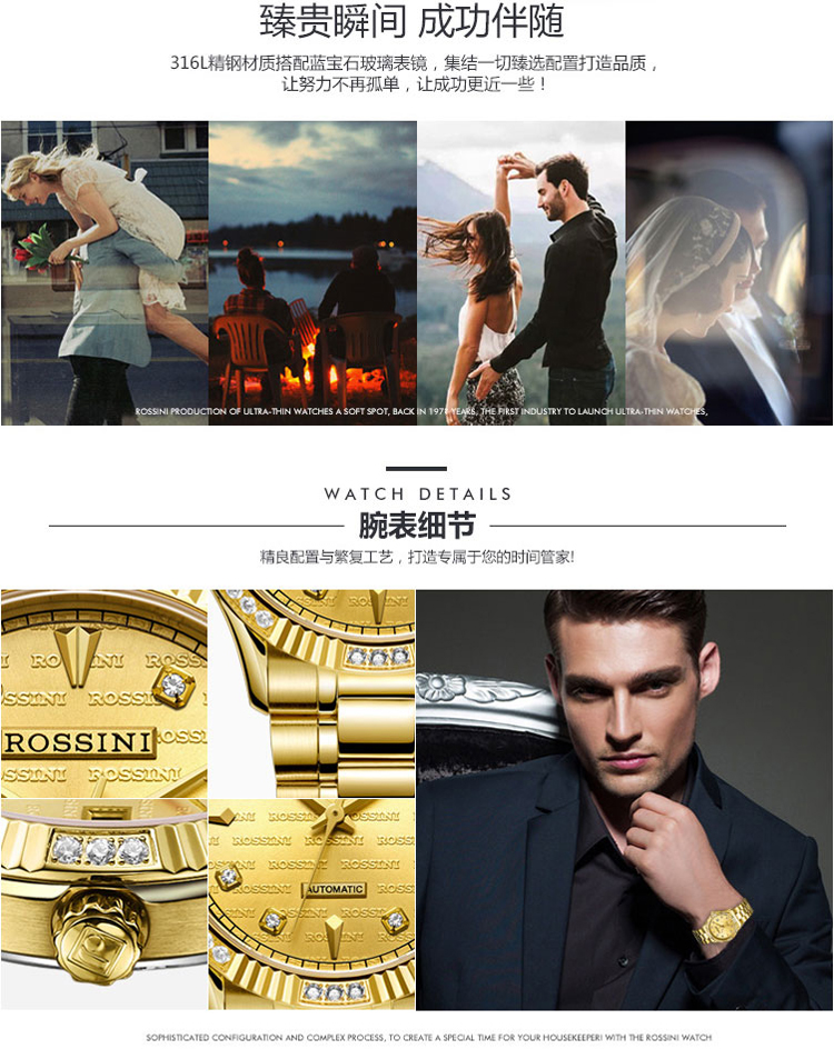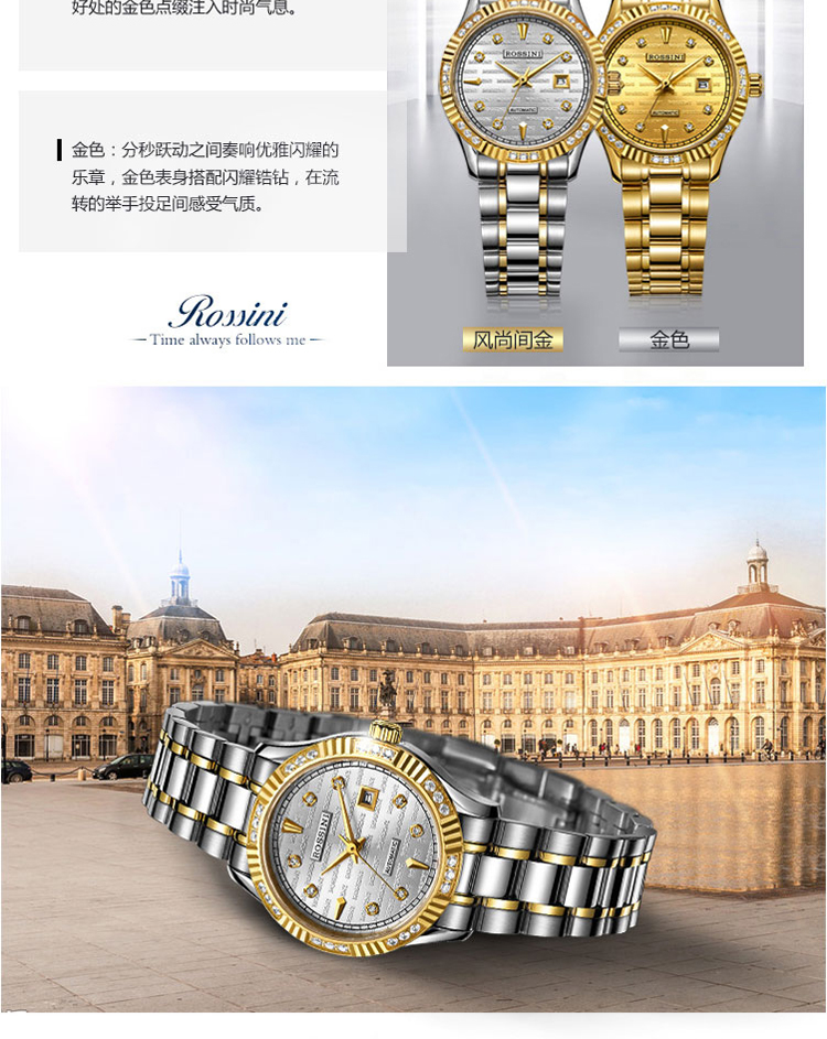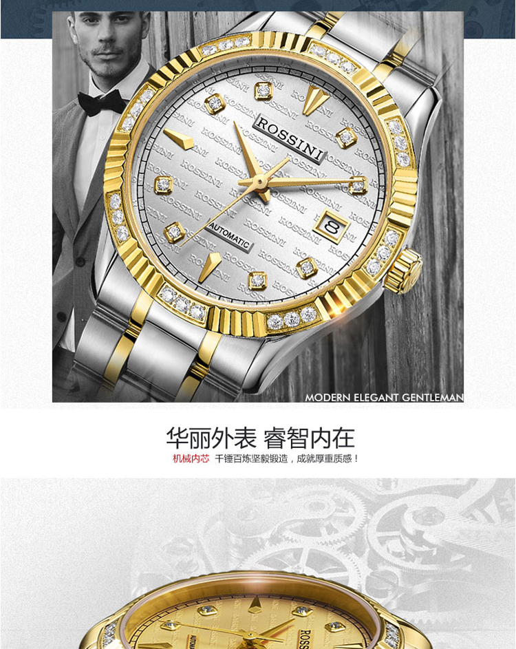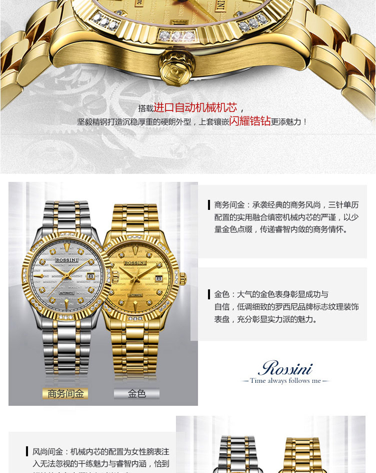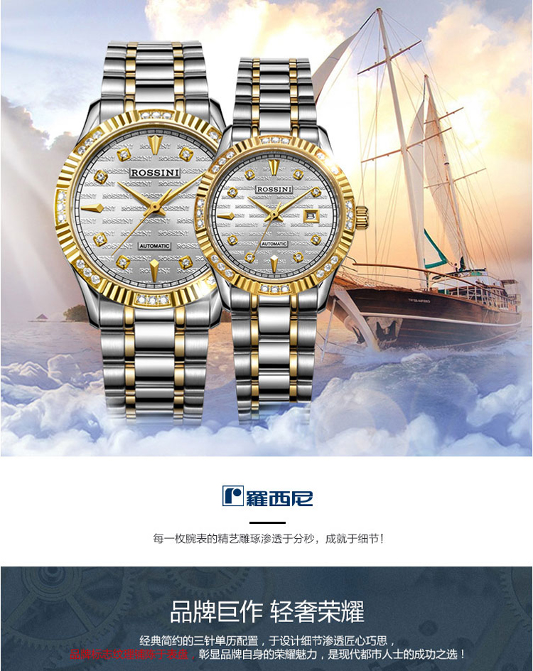 商品名称:Rossini罗西尼 日历镶钻防水自动机械表商务情侣手表 间金金盘钢带男表 6705G06B