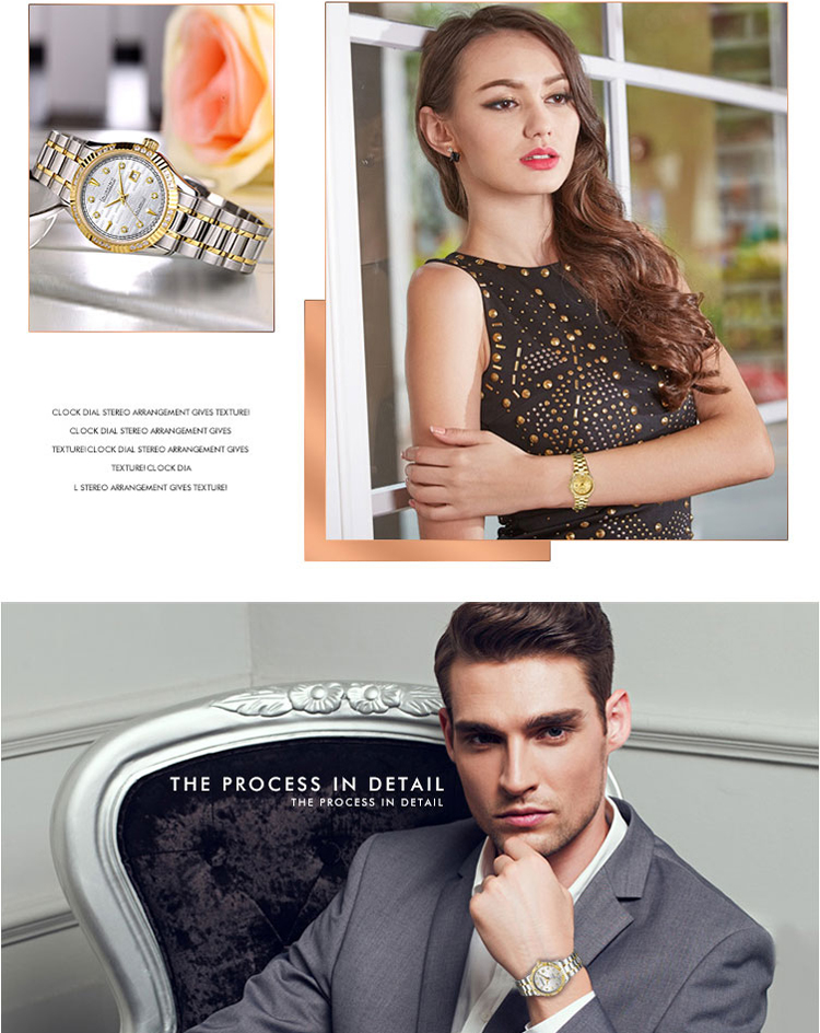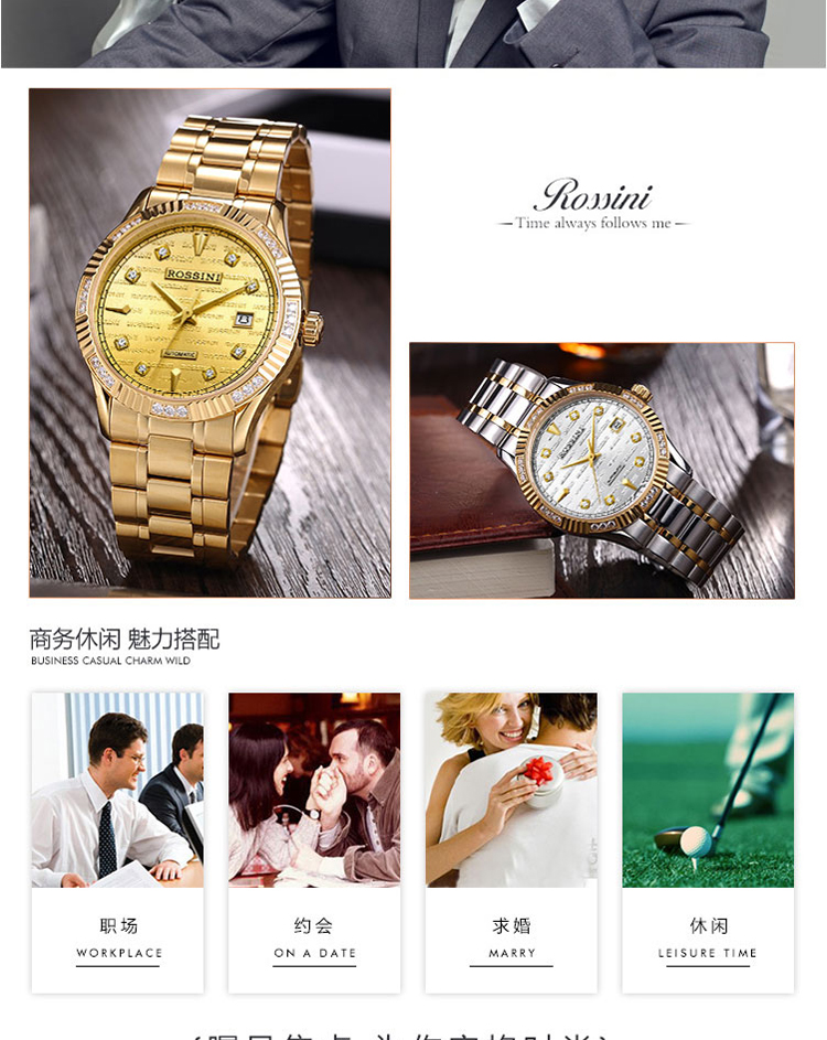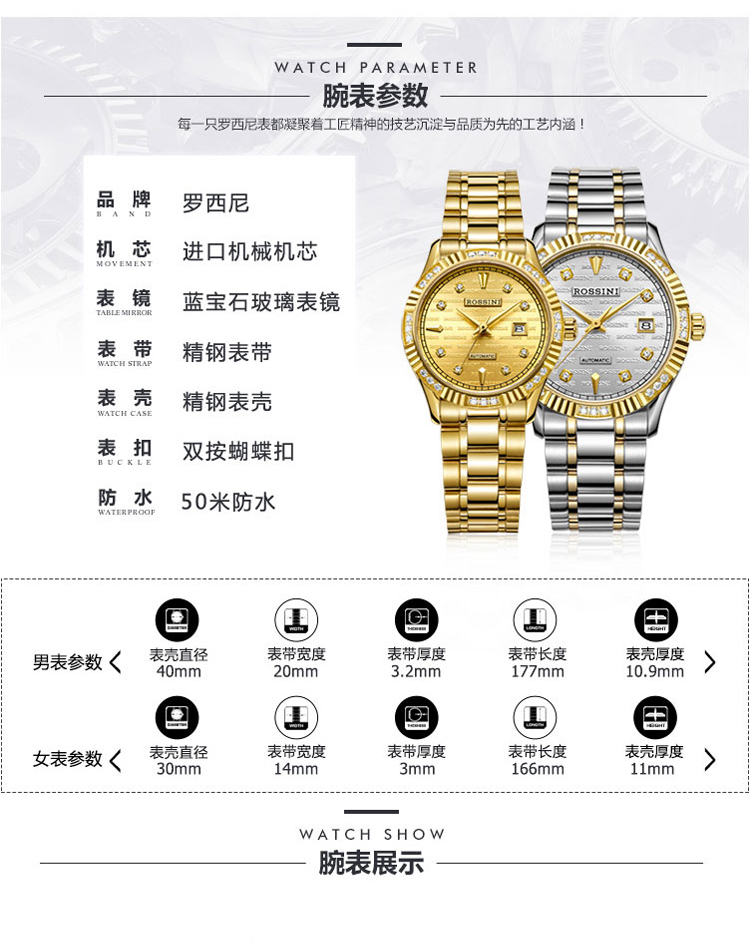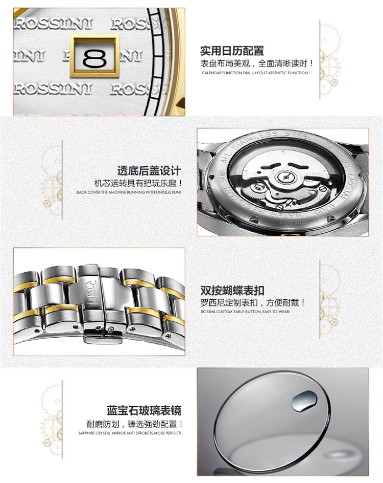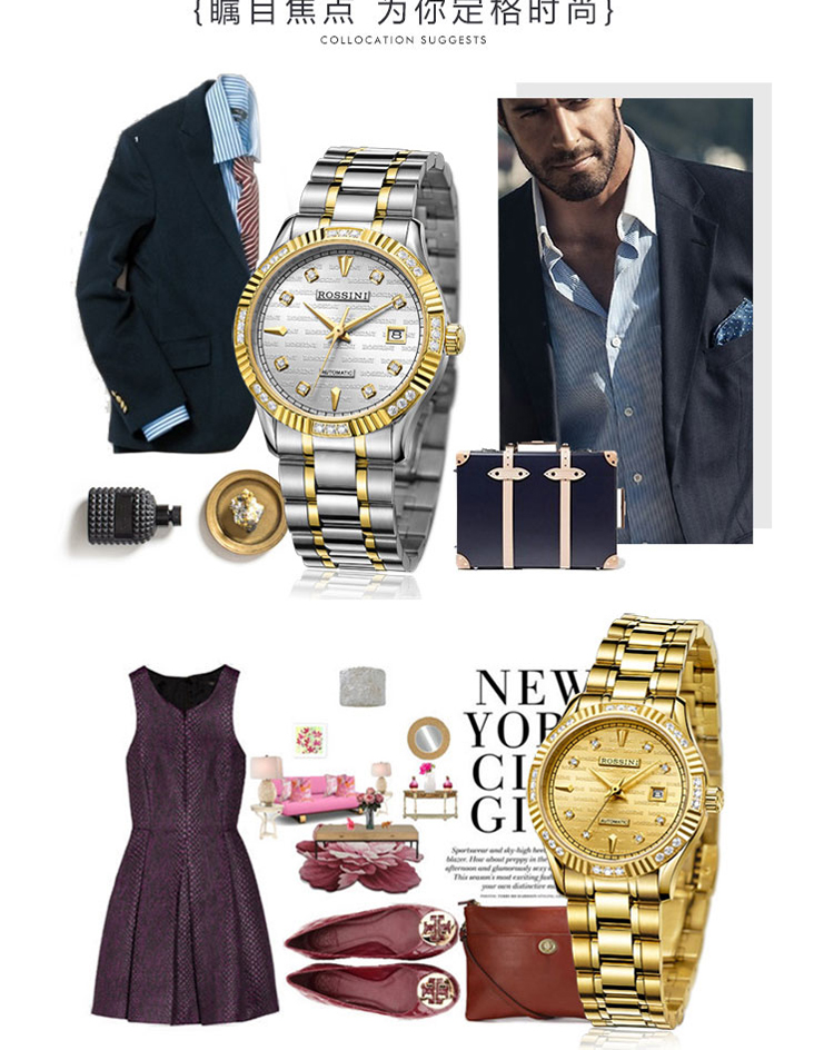 商品名称:Rossini罗西尼 日历镶钻防水自动机械表商务情侣手表 间金金盘钢带男表 6705G06B