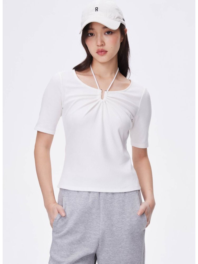【气质淑女】年夏季百搭显瘦挂脖绑带修身T恤女 088410