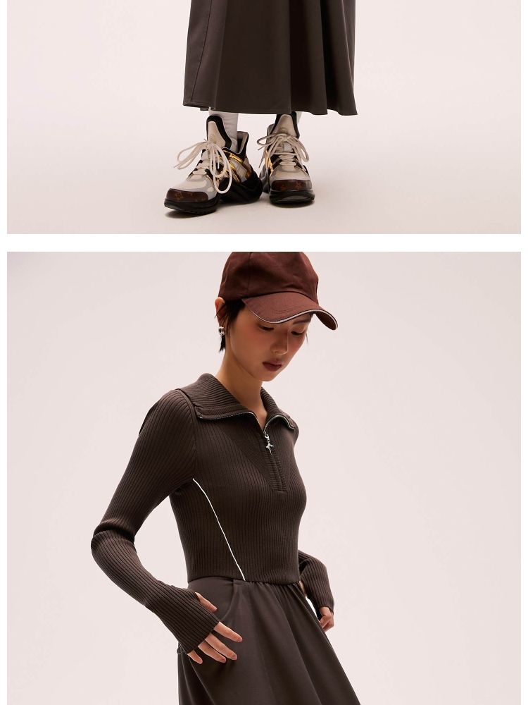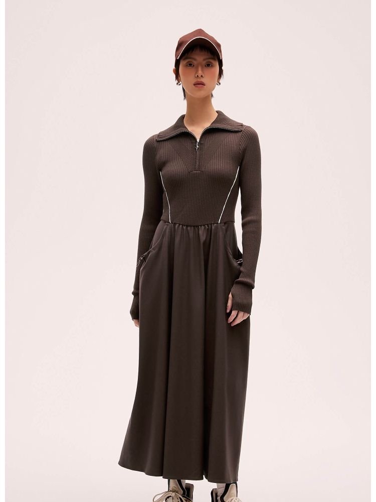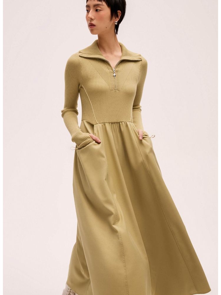【针梭拼接大摆伞裙】夏季秋拉链翻领长款抽绳大口袋连衣裙女 194330