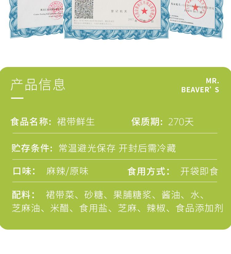 商品名称:海狸先生裙带菜100g*6袋 混合装 酸甜味*3袋 麻辣味*3袋