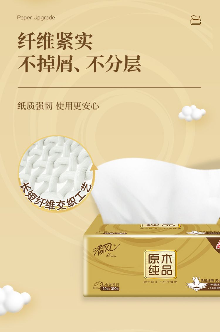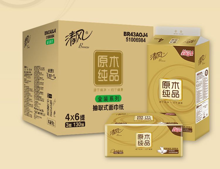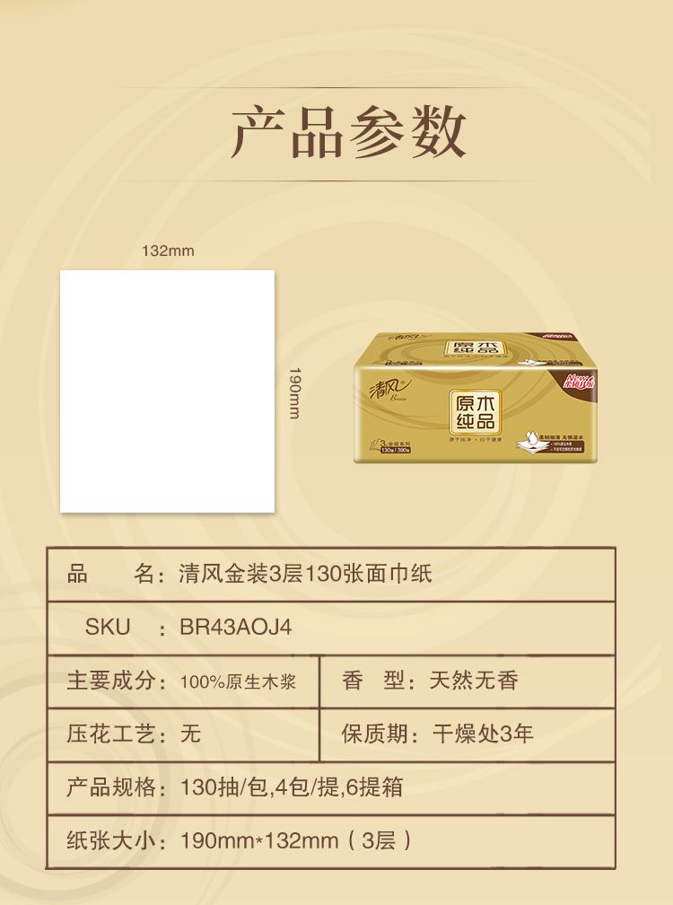 商品名称:清风 原木金装3层抽取式面巾纸(130抽/包*24包/箱)