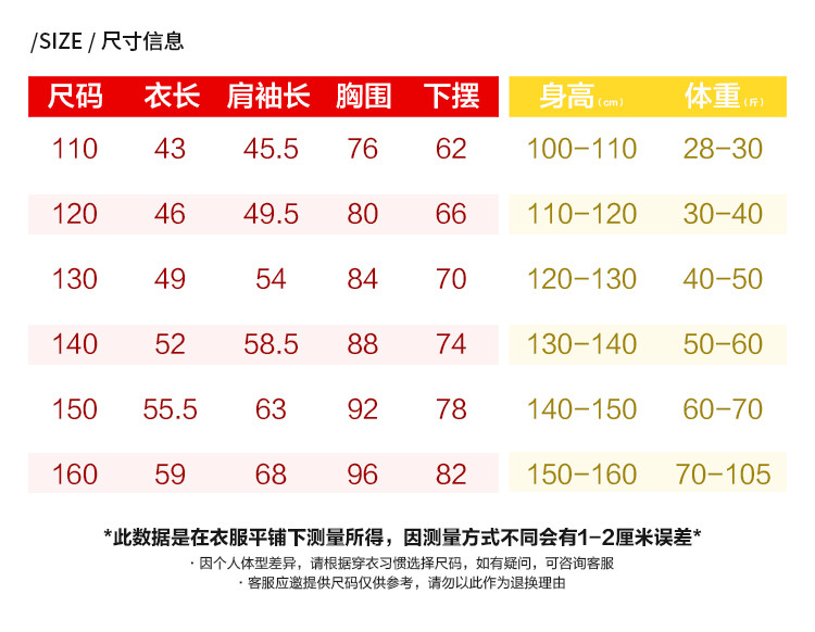| 尺码 | 衣长(cm) | 肩宽(cm) | 身高(cm) | 袖长(cm) | 适合年龄 | 胸围(cm) | 号型 |