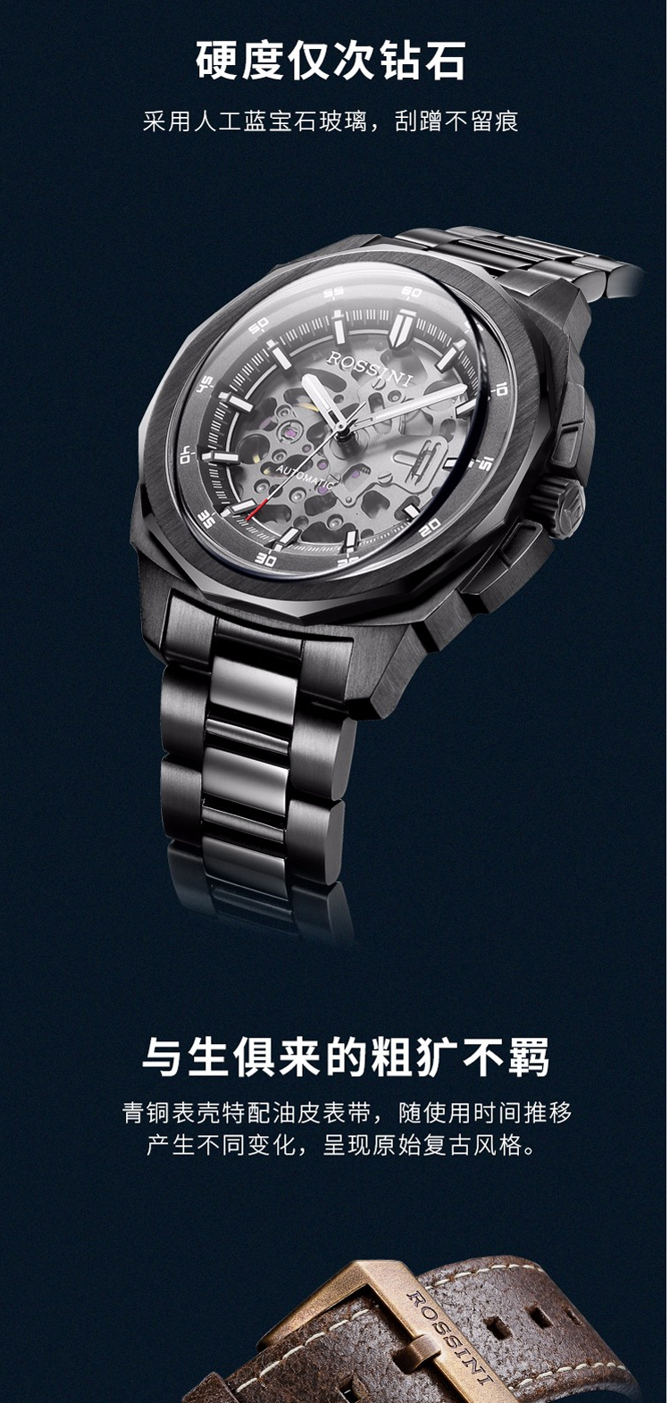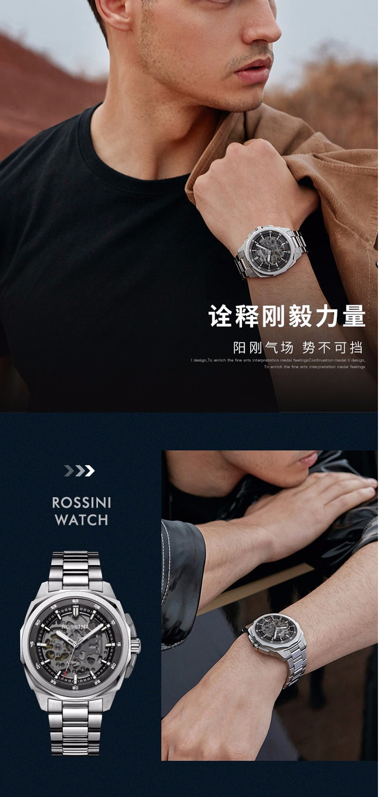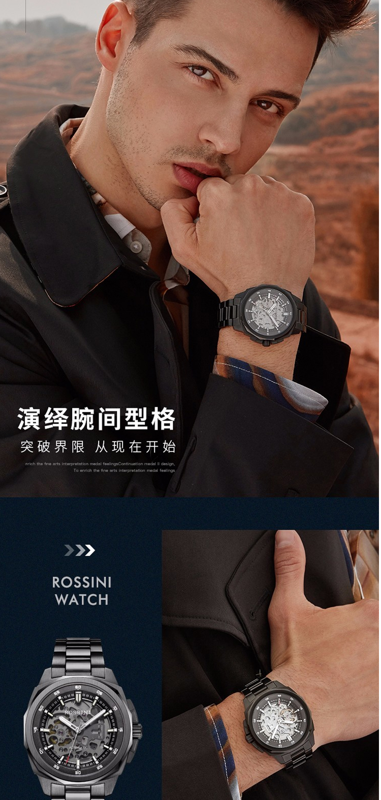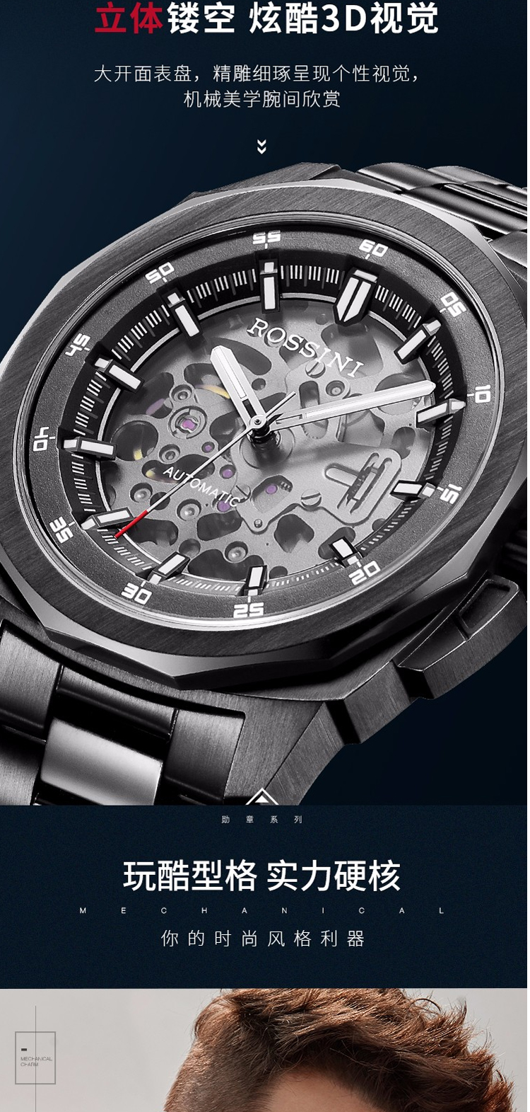 商品名称:Rossini罗西尼 勋章系列 自动机械手表潮流时尚酷黑镂空黑盘钢带男表 5979B02B