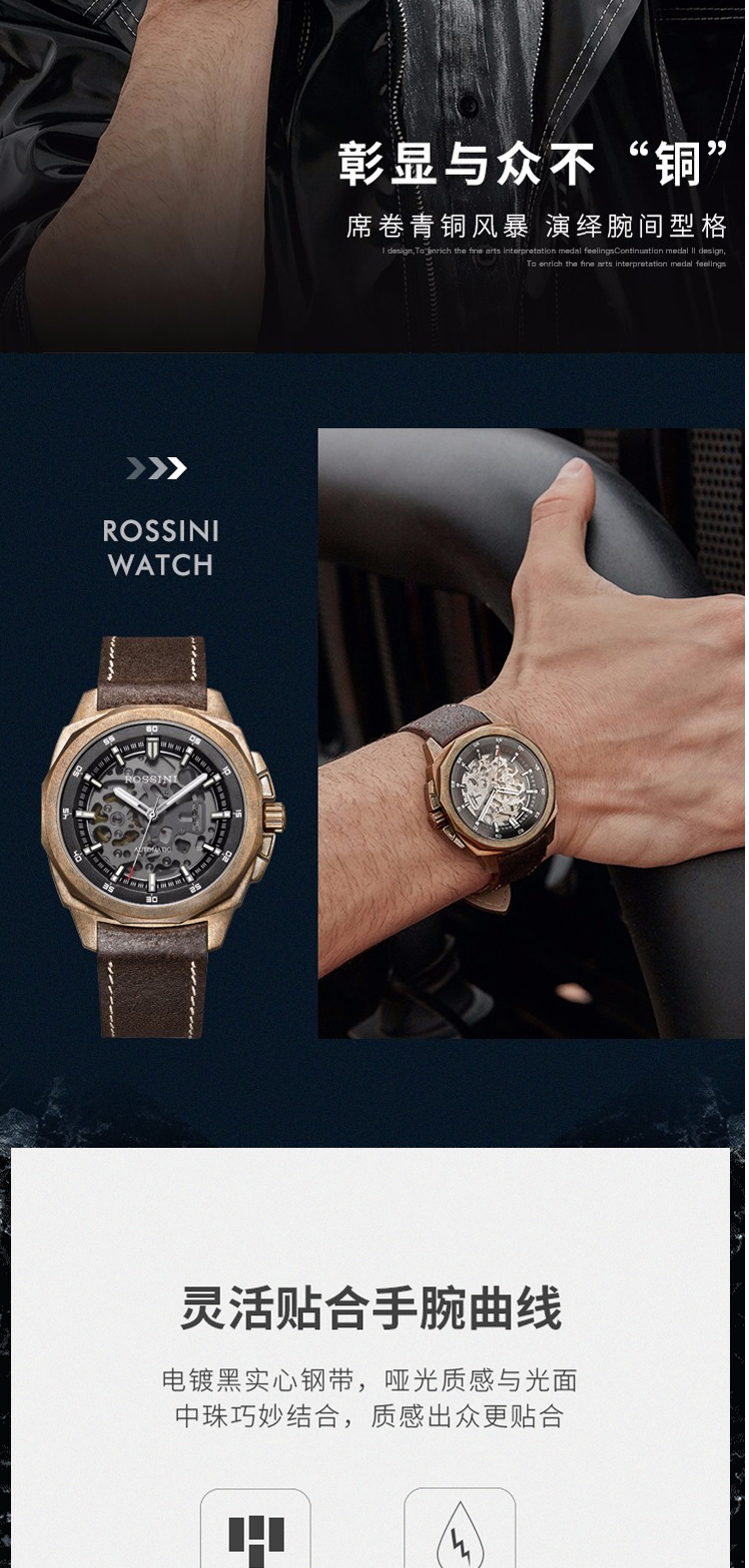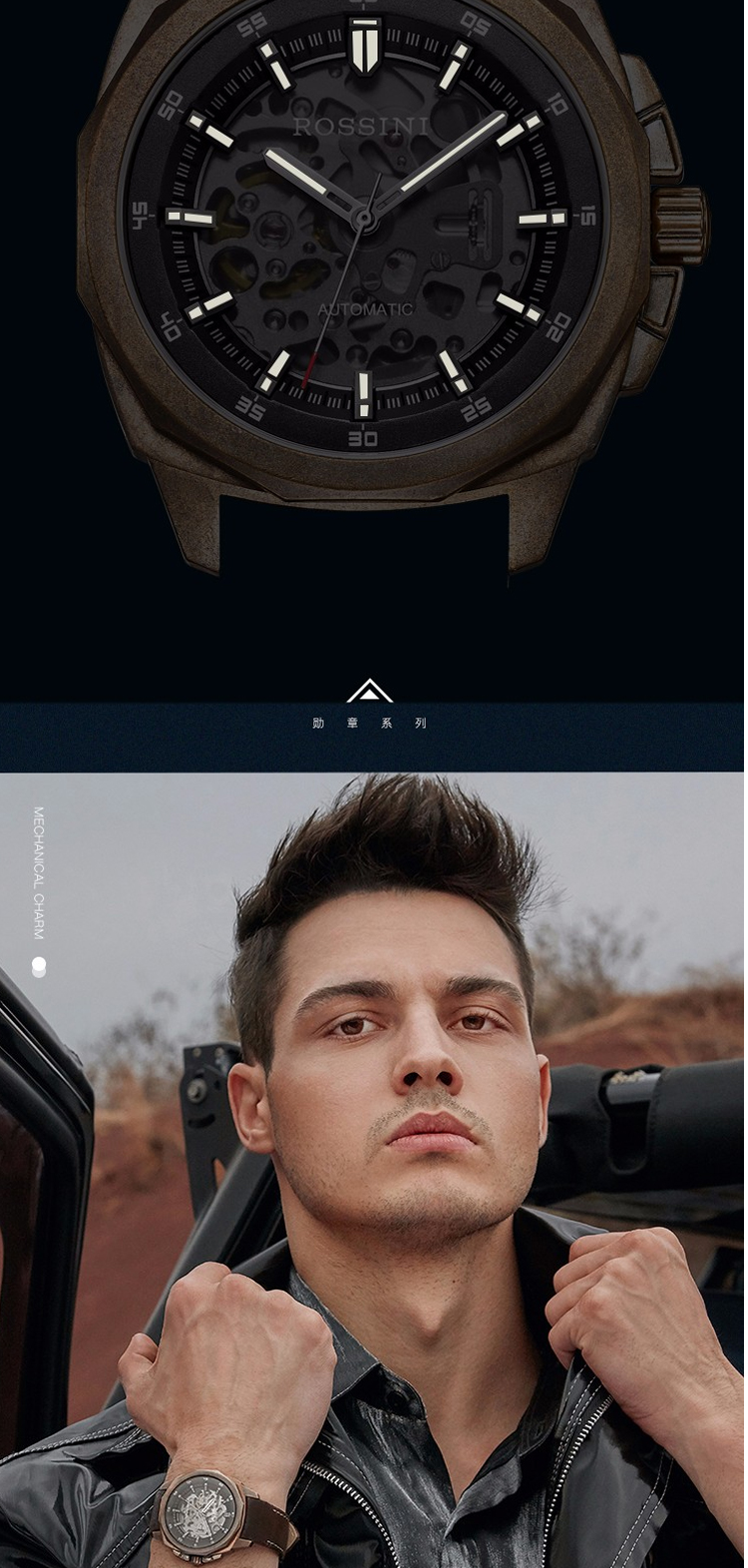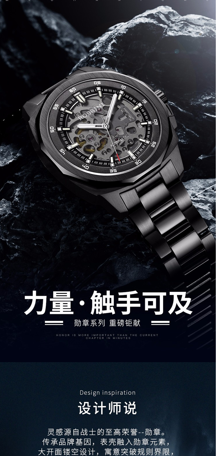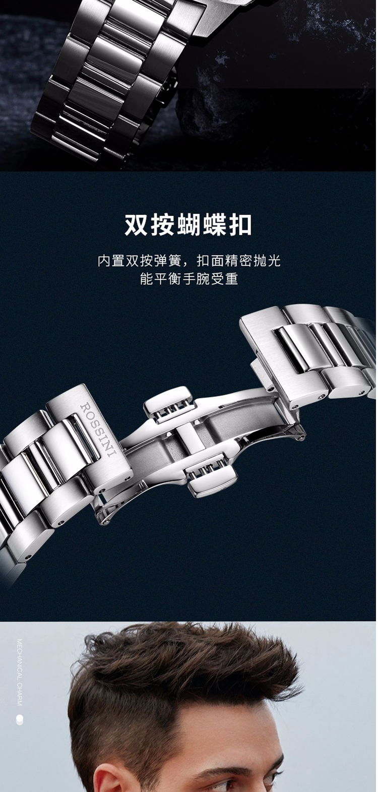 商品名称:Rossini罗西尼 勋章系列 自动机械手表潮流时尚酷黑镂空黑盘钢带男表 5979B02B