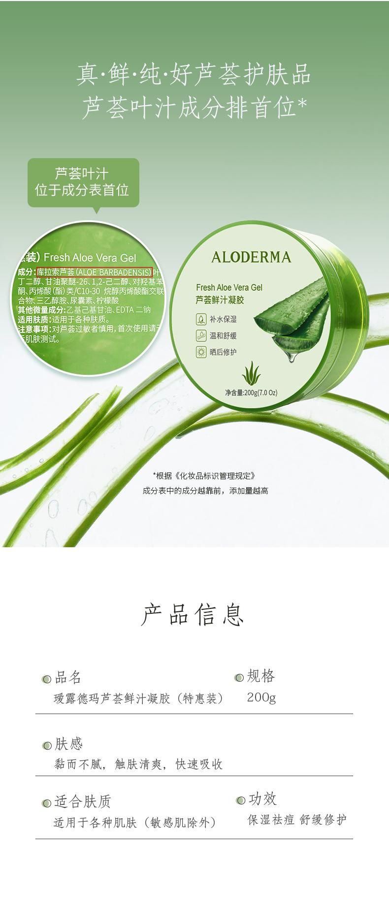 商品名称:瑷露德玛 芦荟鲜汁凝胶(特惠装) 200g 补水保湿修护