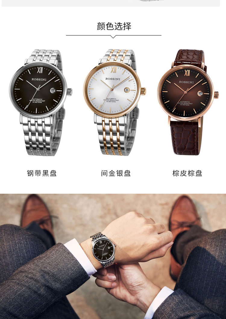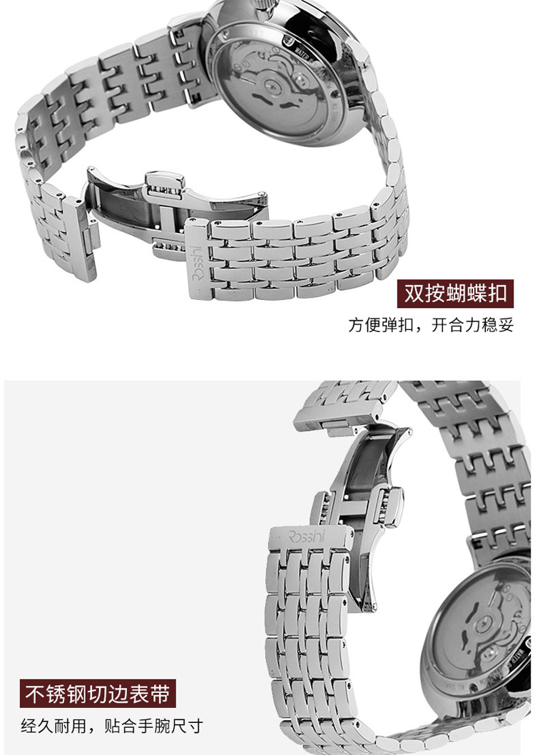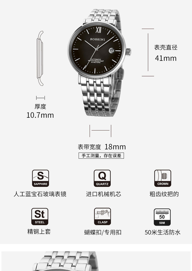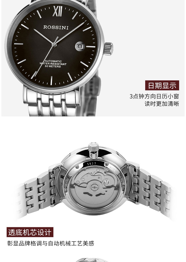 商品名称:Rossini罗西尼 机械手表商务休闲日历黑盘钢带男表 5827W04B