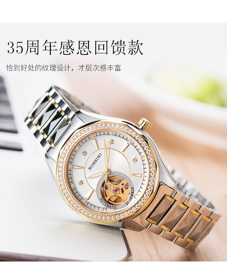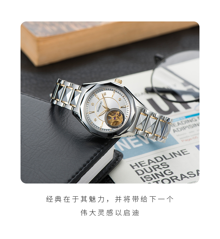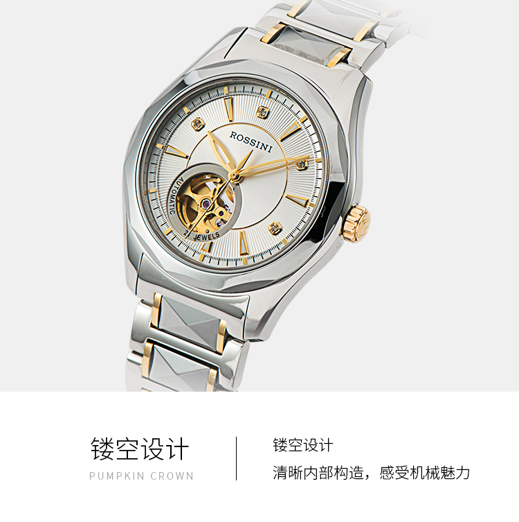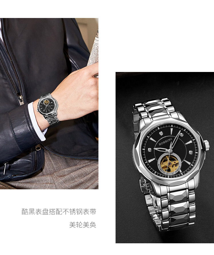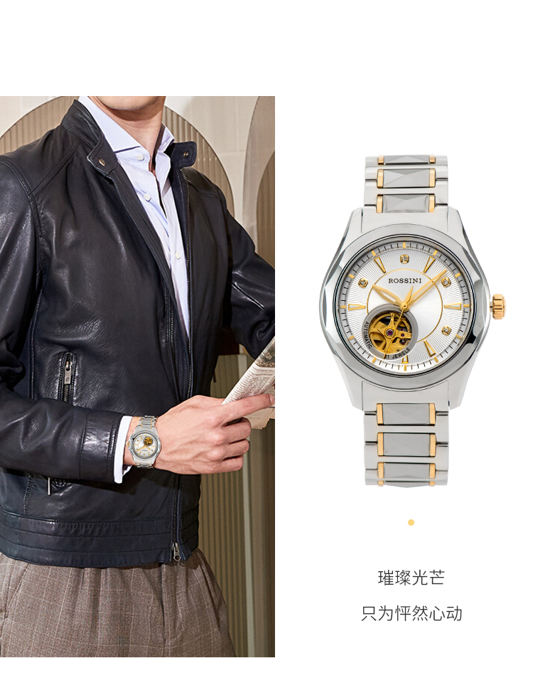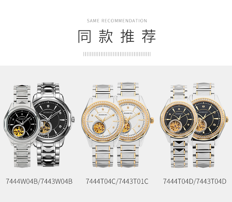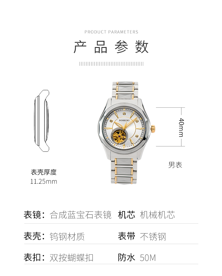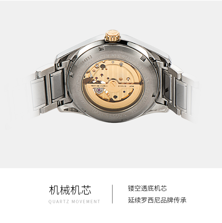 商品名称:Rossini罗西尼 时尚简约商务品质百搭防水机械手表白盘钢带男表7443W01A