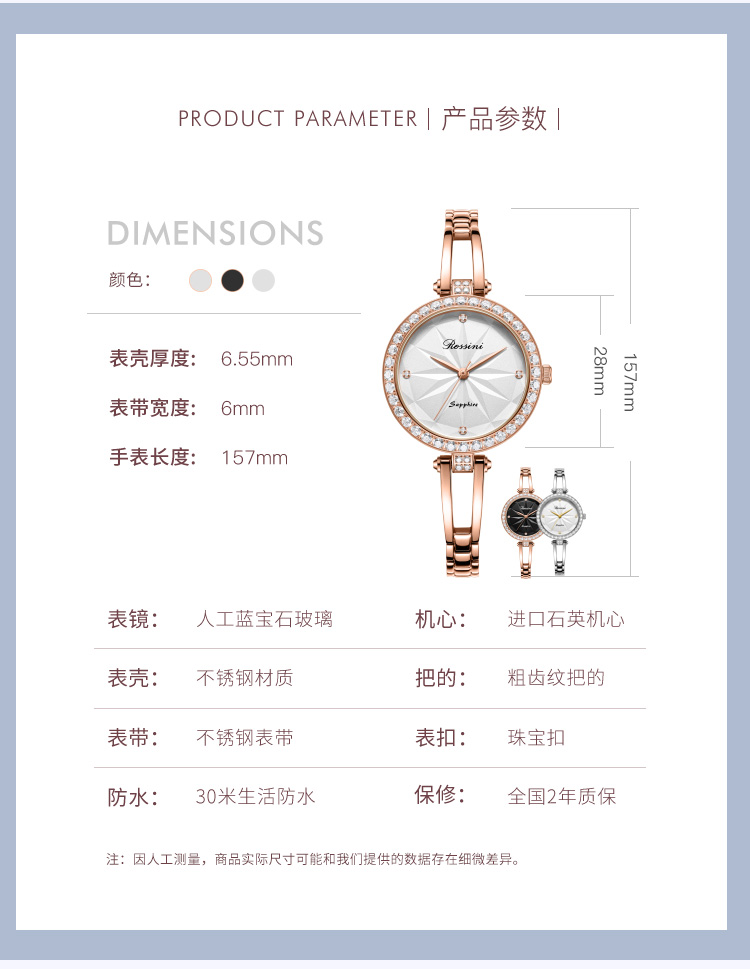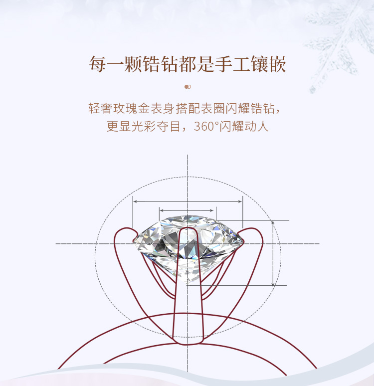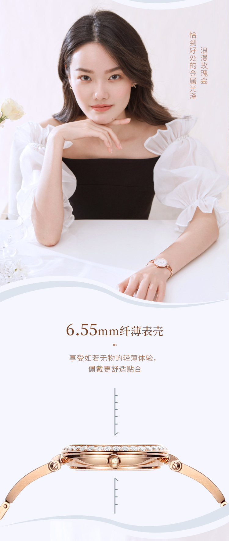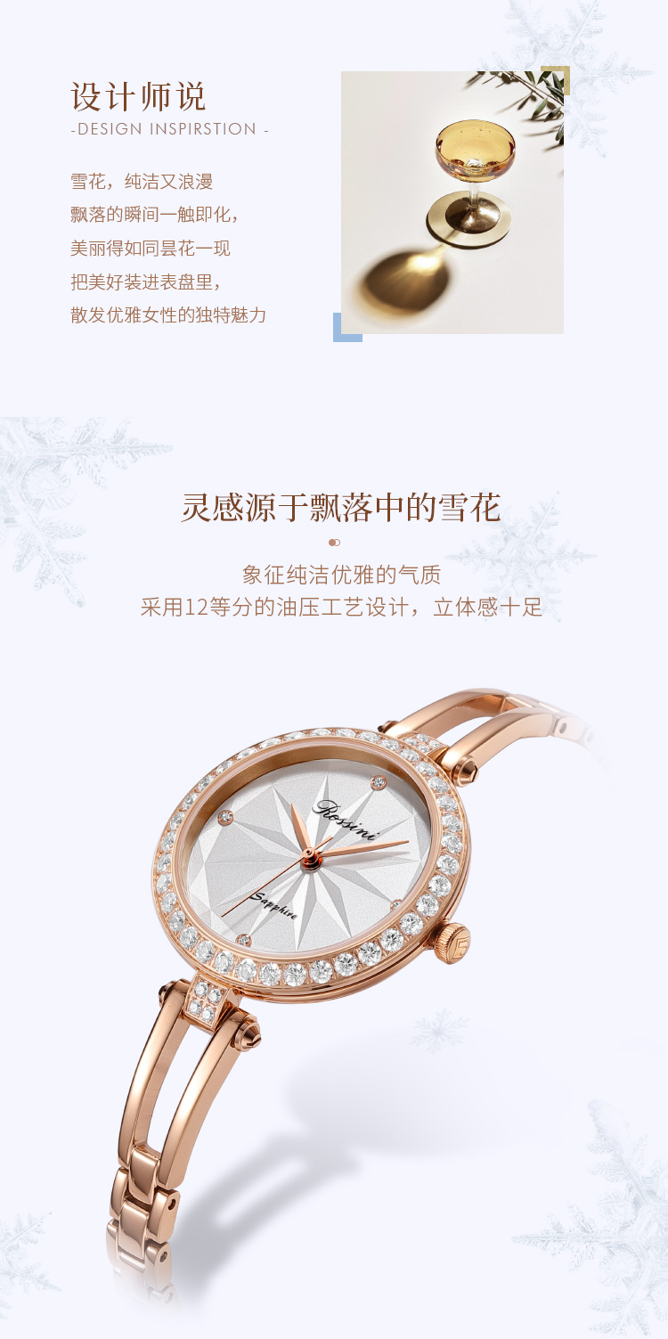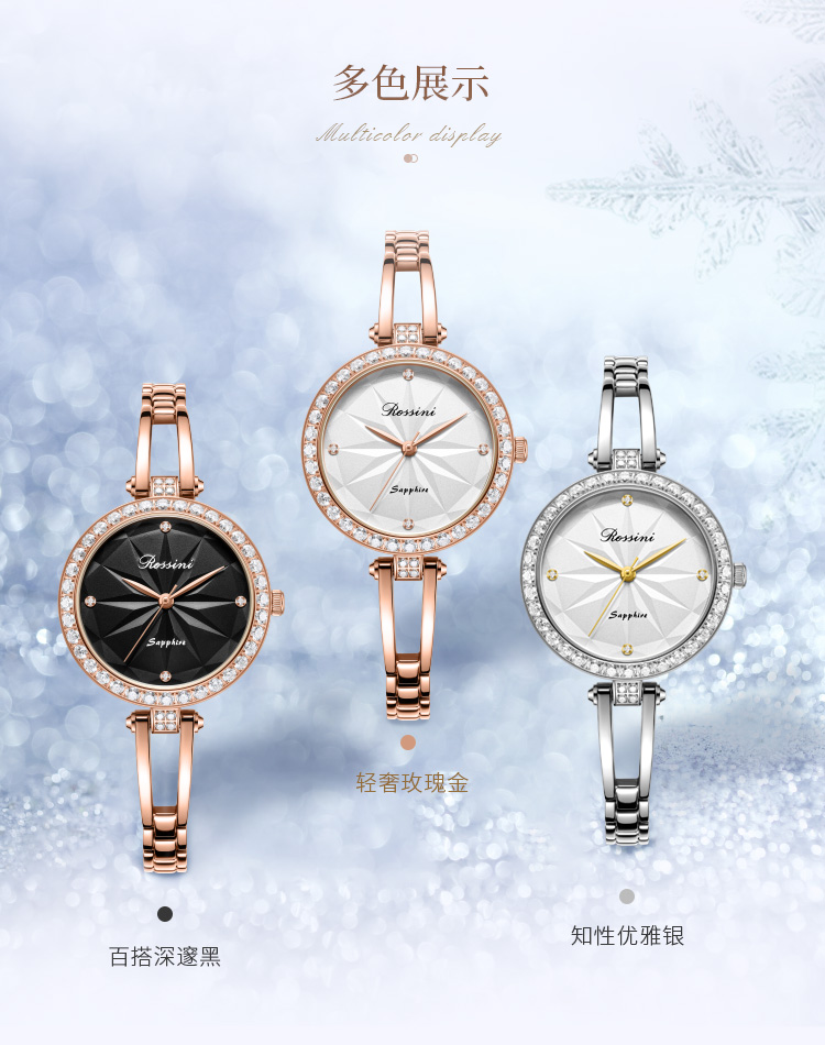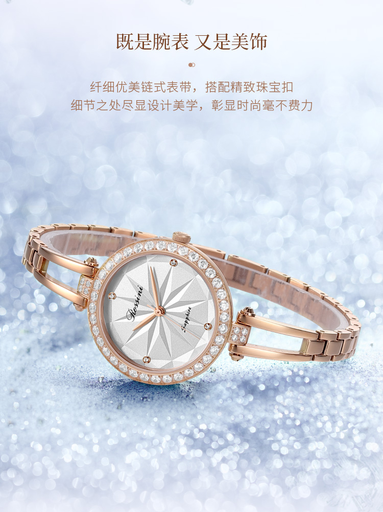 商品名称:Rossini罗西尼 【专柜同款】启迪系列时尚石英女表镶钻雪花白盘玫瑰金钢带女表5988G01B
