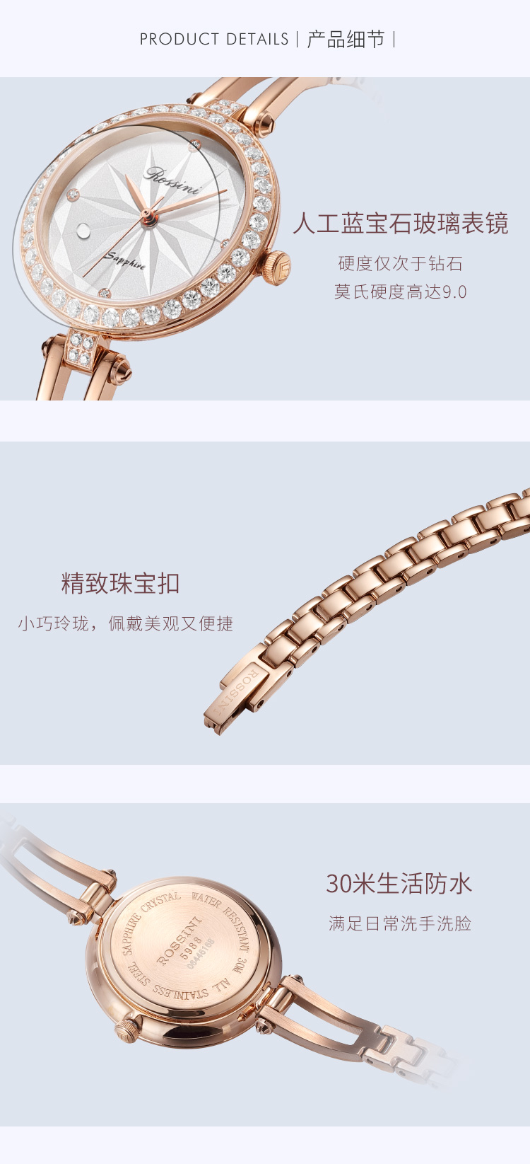 Rossini罗西尼 【专柜同款】启迪系列时尚石英女表镶钻雪花白盘玫瑰金钢带女表5988G01B
