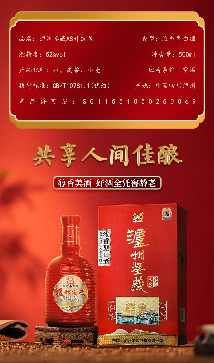 商品名称:泸州老窖 泸州鉴藏A8升级版浓香型白酒500ml*6瓶礼盒装