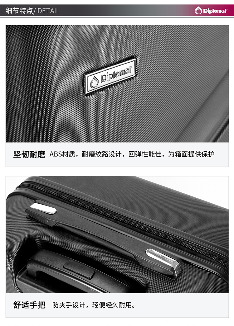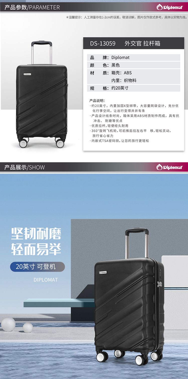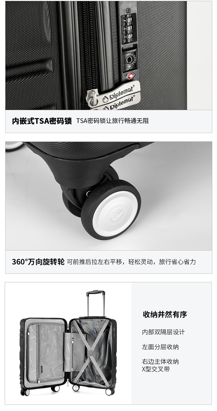 商品名称:Diplomat 外交官休闲万向轮拉杆箱DS-13059 黑色 20英寸