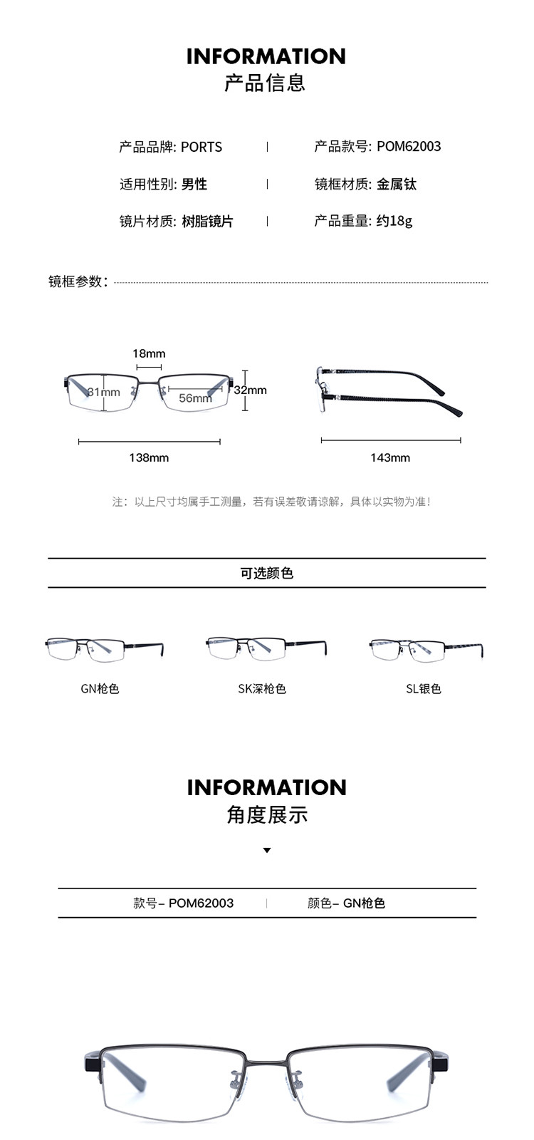 商品名称:PORTS商务经典方形时尚男士商务眼镜架POM62003 647114
