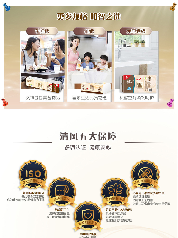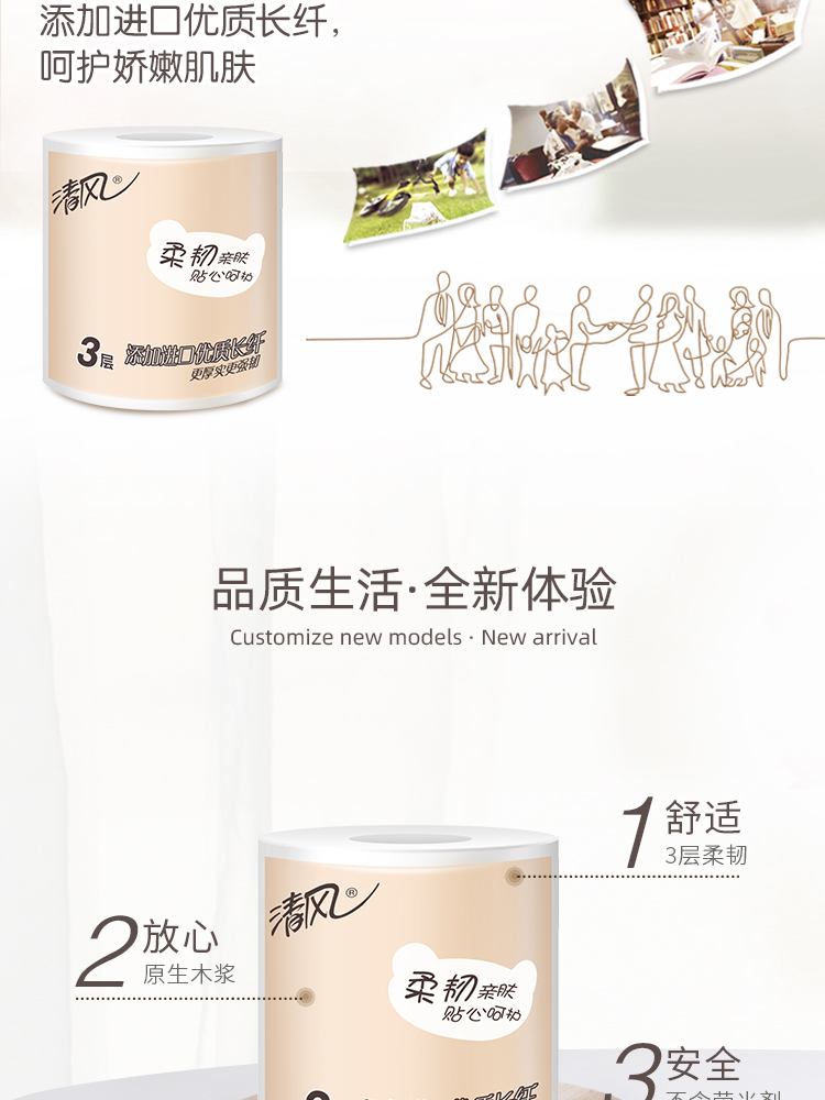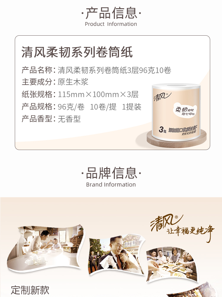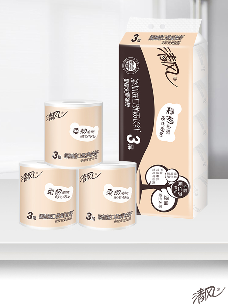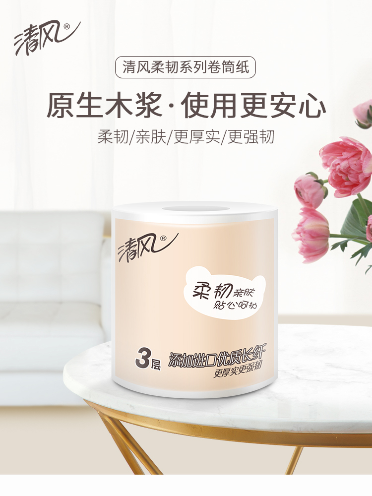 商品名称:清风卫生纸柔韧系列原生木浆卷纸3层卷筒10卷/提