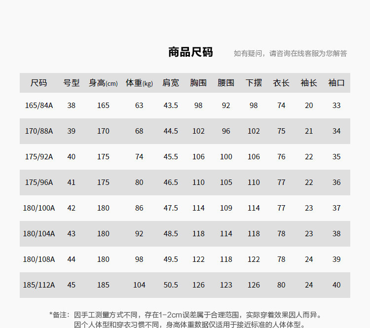 38(推荐58~63kg) 74 43.5 92 20 98 98 165/84A