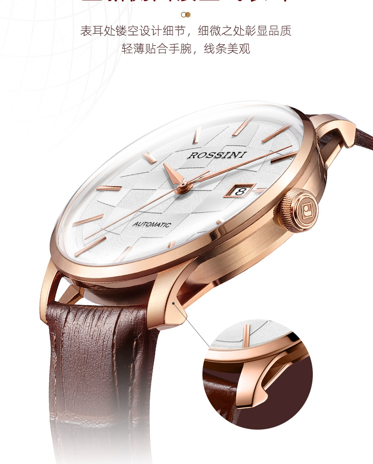 商品名称:Rossini罗西尼 启迪系列环球腕表 机械手表时尚日表防水休闲白盘钢带女表50028G01A